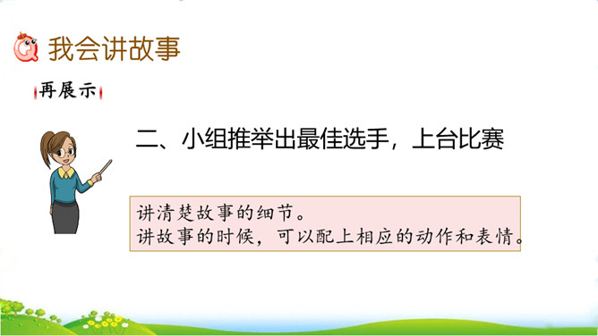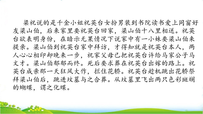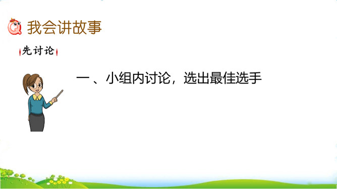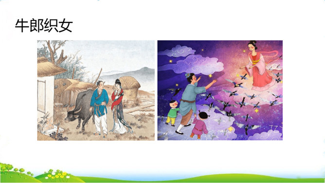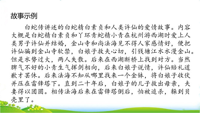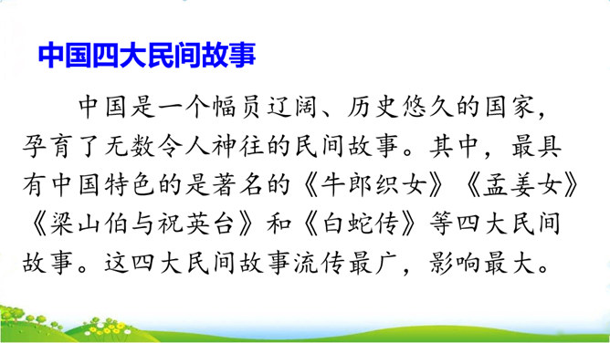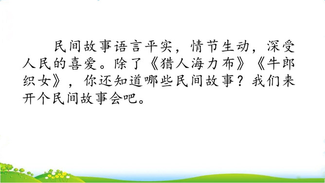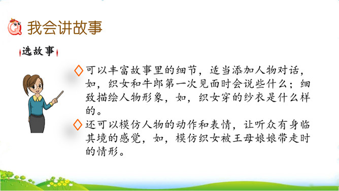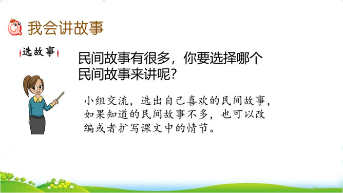 民间故事有很多,你要选择哪个民间故事来讲呢?小组交流,选出自己喜欢的民间故事,如果知道的民间故事不多,也可以改编或者扩写课文中的情节。可以丰富故事里的细节,适当添加人物对话,如,织女和牛郎第一次见面时会说些什么;细致描绘人物形象,如,织女穿的纱衣是什么样的。还可以模仿人物的动作和表情,让听众有身临其境的感觉,如,模仿织女被王母娘娘带走时的情形。所属专题:讲民间故事ppt。