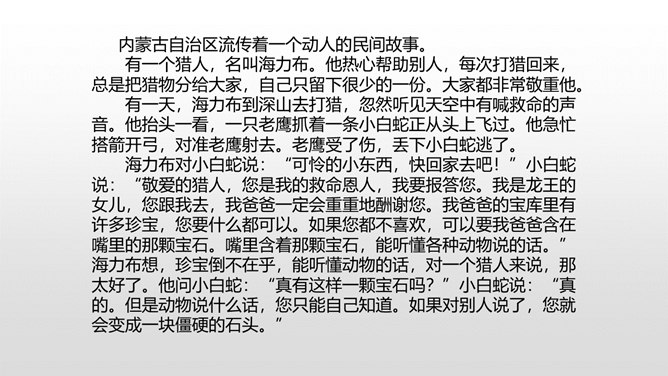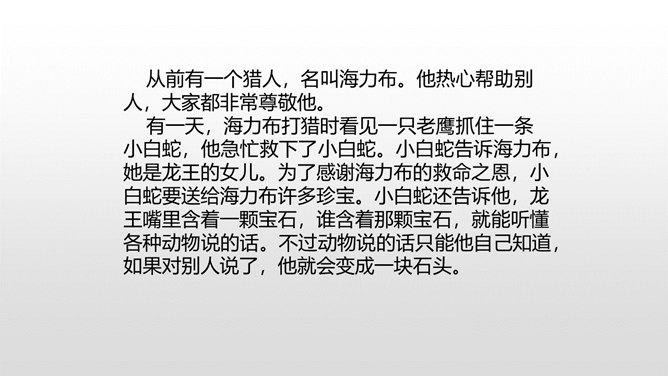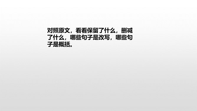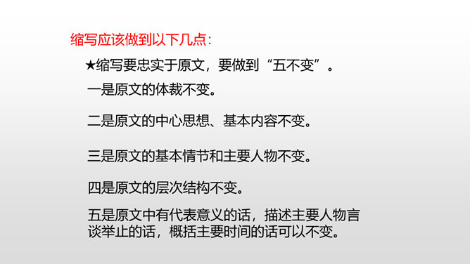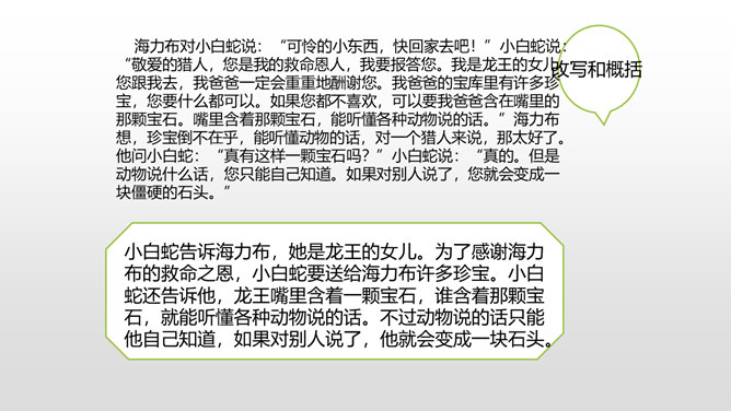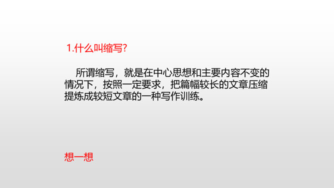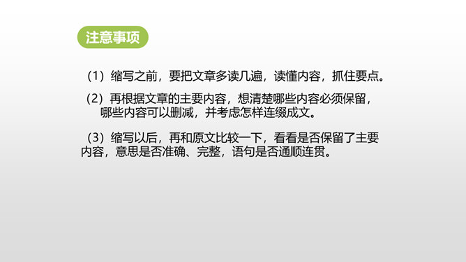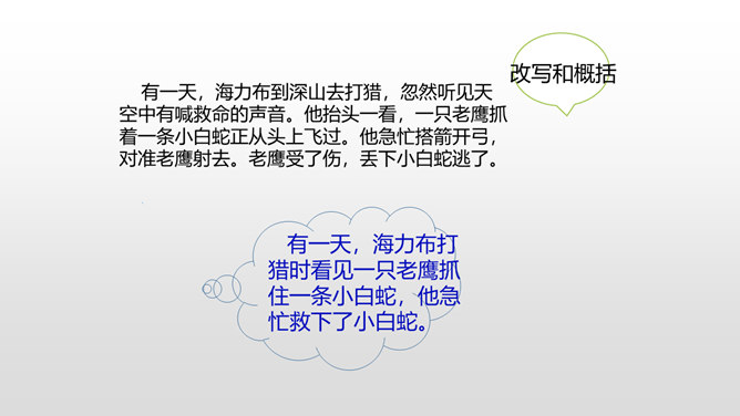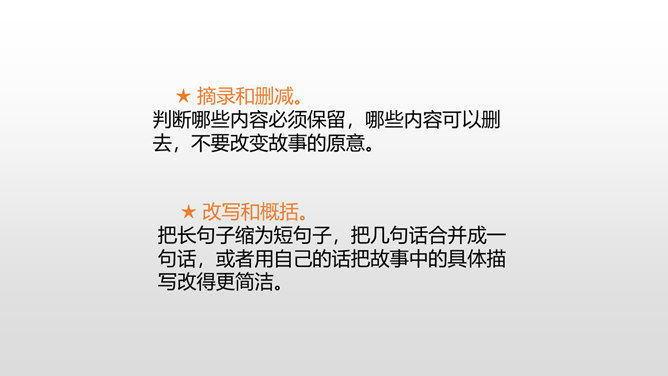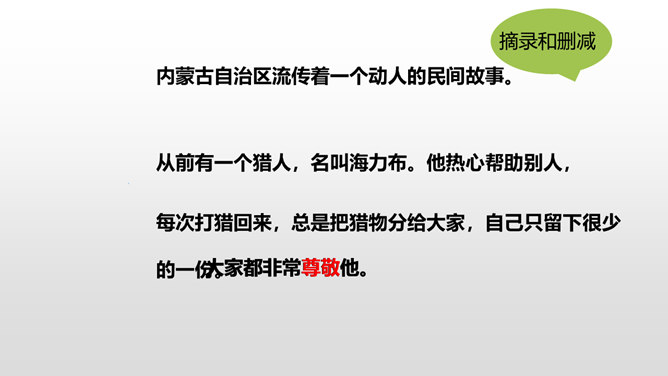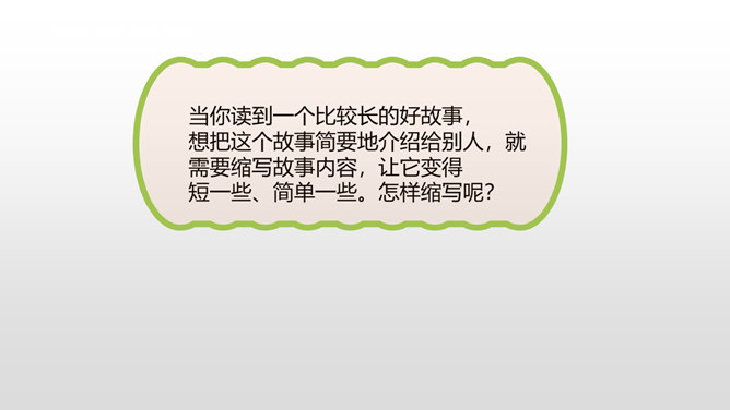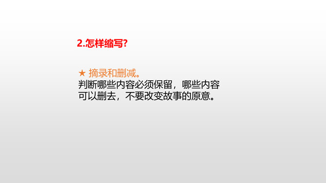 当你读到一个比较长的好故事,想把这个故事简要地介绍给别人,就需要缩写故事内容,让它变得短一些、简单一些。怎样缩写呢?所谓缩写,就是在中心思想和主要内容不变的情况下,按照一定要求,把篇幅较长的文章压缩提炼成较短文章的一种写作训练。对照原文,看看保留了什么,删减了什么,哪些句子是改写,哪些句子是概括。判断哪些内容必须保留,哪些内容可以删去,不要改变故事的原意。所属专题:缩写故事ppt。