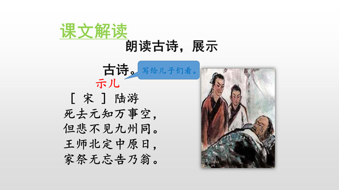 这首诗用笔曲折,情真意切地表达了诗人临终时复杂的思想情绪和他忧国忧民的爱国情怀,既有对抗金大业未就的无穷遗恨,也有对神圣事业必成的坚定信念。全诗有悲的成分,但基调是激昂的。诗人用奇特的想象表现了他热烈的希望,他期待着优秀杰出人物的涌现,期待着改革大势形成新的“风雷”、新的生机,一扫笼罩九州的沉闷和迟滞的局面,既揭露矛盾、批判现实,更憧憬未来、充满理想。