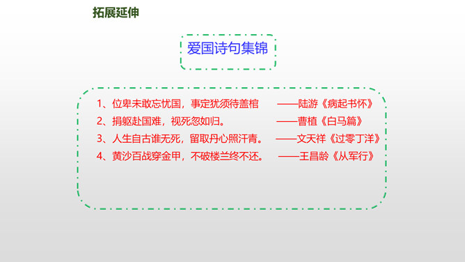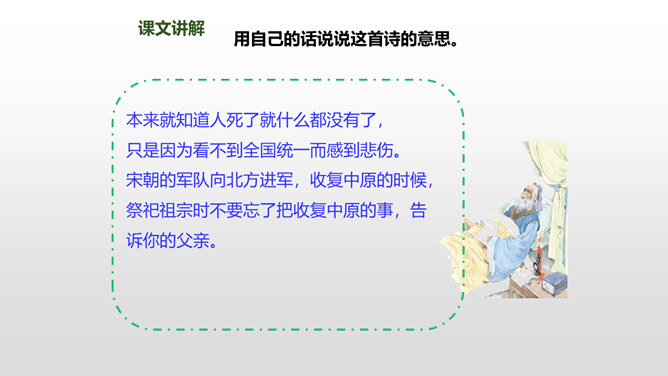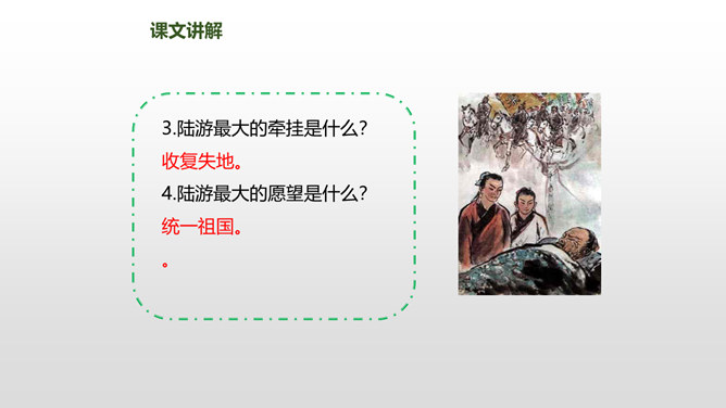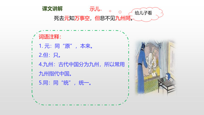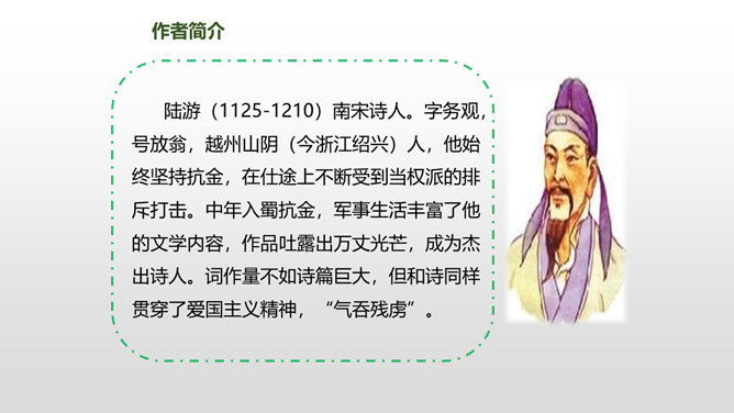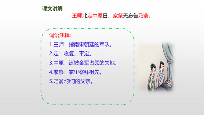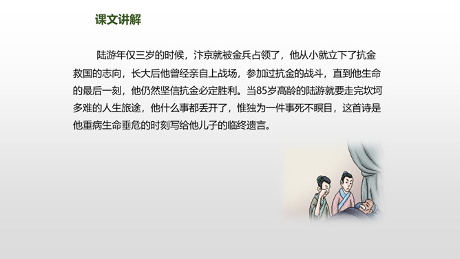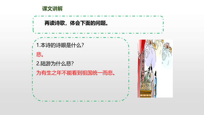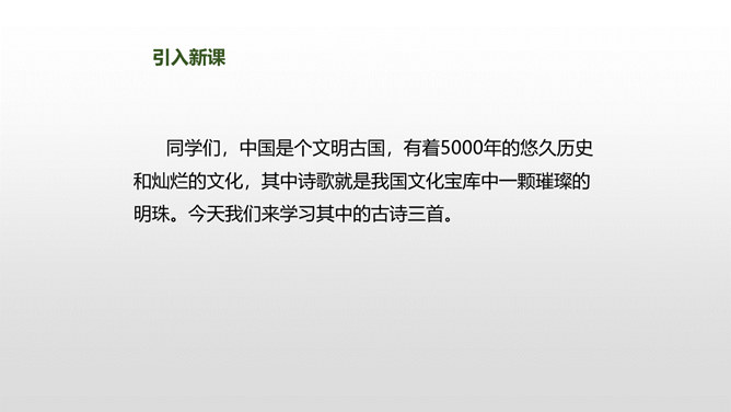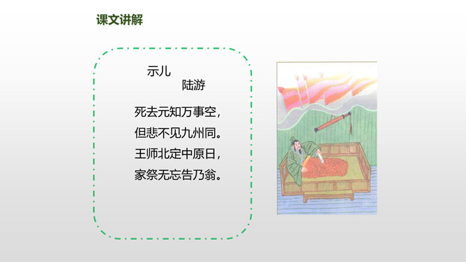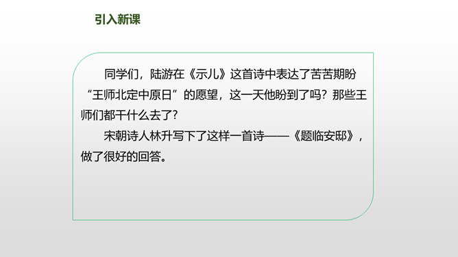 同学们,中国是个文明古国,有着5000年的悠久历史和灿烂的文化,其中诗歌就是我国文化宝库中一颗璀璨的明珠。今天我们来学习其中的古诗三首。同学们,陆游在《示儿》这首诗中表达了苦苦期盼 “王师北定中原日”的愿望,这一天他盼到了吗?那些王师们都干什么去了?宋朝诗人林升写下了这样一首诗——《题临安邸》,做了很好的回答。诗人用反问的语气质问那些醉生梦死的贵族统治者:你们在西湖边所过的听歌看舞的荒淫生活,到什么时候才会停止呢?表达了诗人极为愤慨的心情。