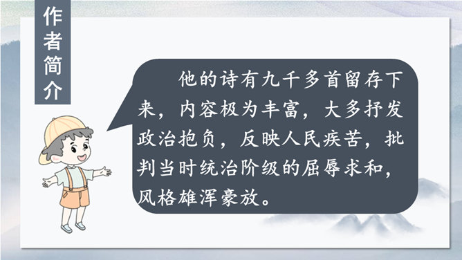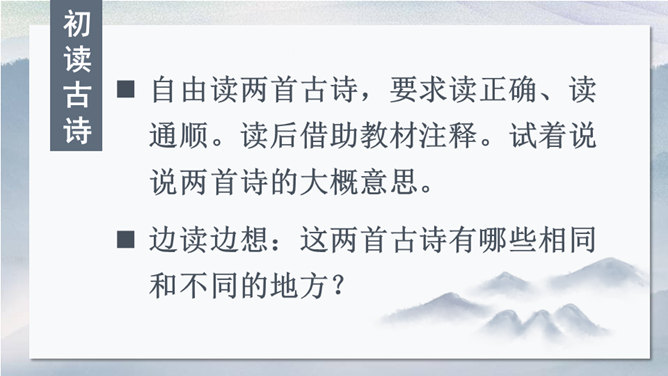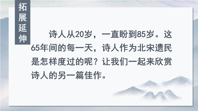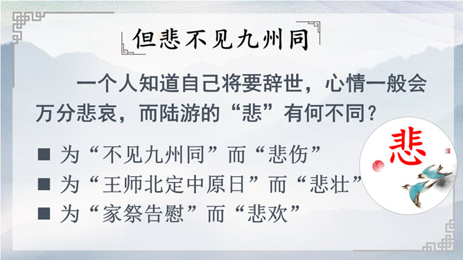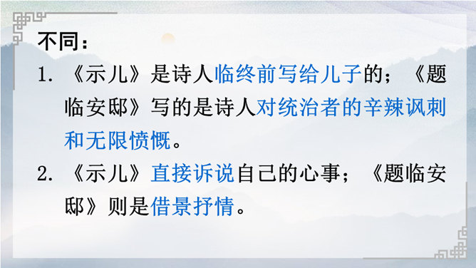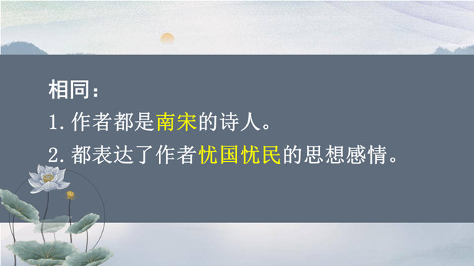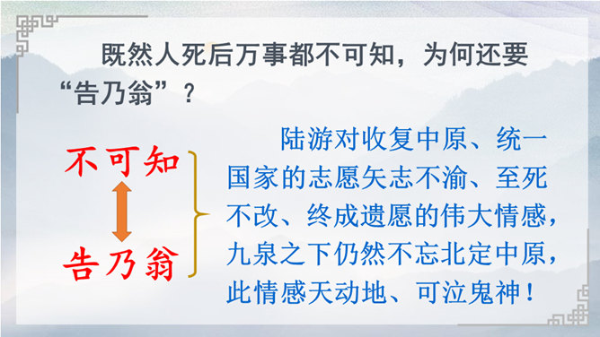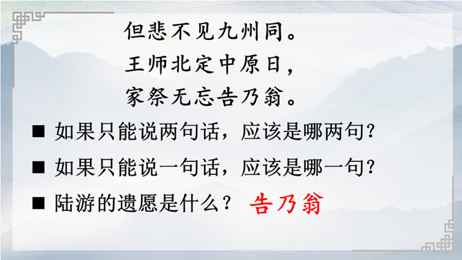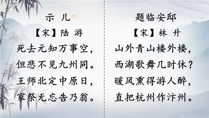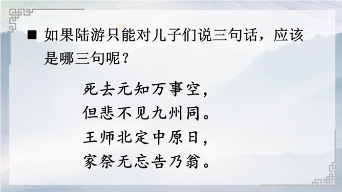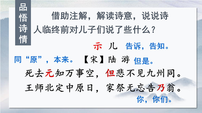 自由读两首古诗,要求读正确、读通顺。读后借助教材注释。试着说说两首诗的大概意思。边读边想:这两首古诗有哪些相同和不同的地方?一个人临终前,一般会给儿女留下什么样的遗言?而陆游的遗言有何不同?就在陆游临终之际还在盼望统一的时候,那些令人心凉的南宋王师干什么去了呢?读着这个“醉”字,你的眼前仿佛出现了怎样的画面?这些权贵成天灯红酒绿,烂醉如泥,如行尸走肉。