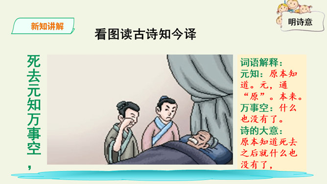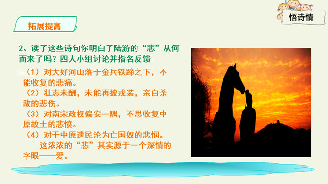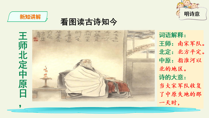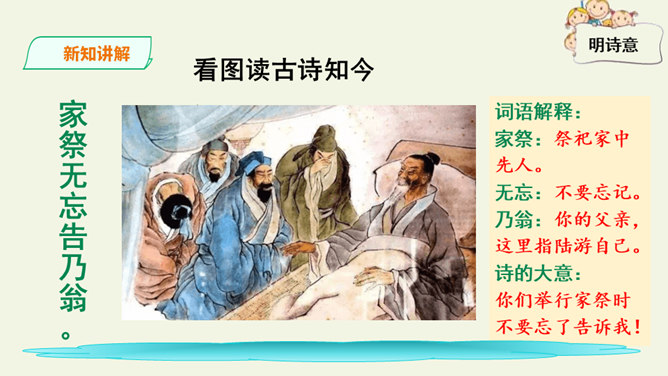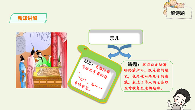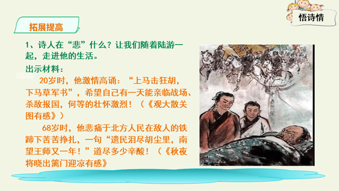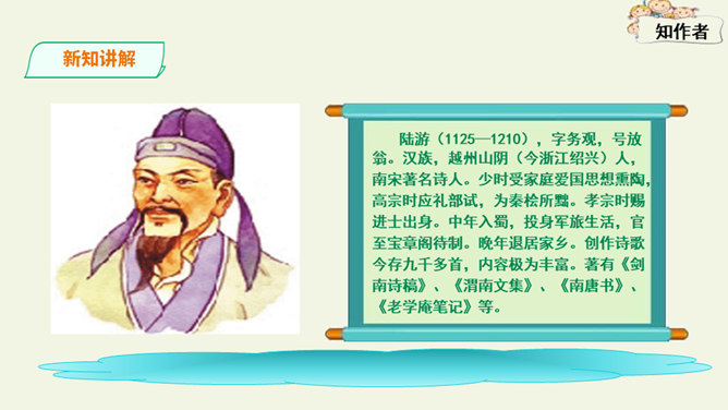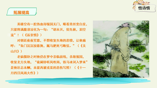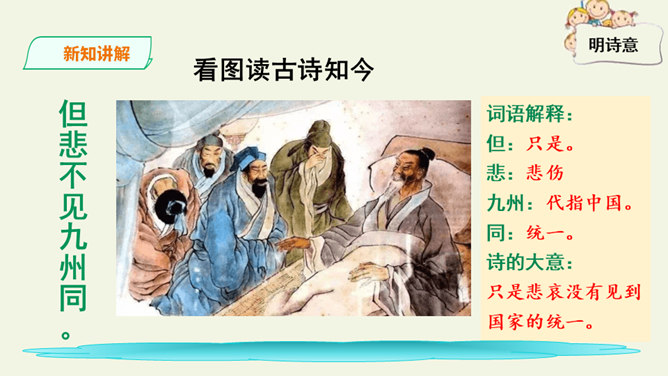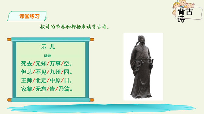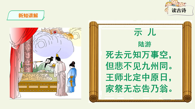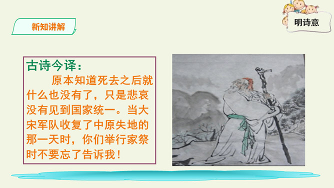 爱国,这是一个永恒的话题!巍巍中华,悠悠历史,有多少仁人志士将毕生的精力献给了自己的国家,留下了一段段可歌可泣的故事!隔着千年的长河,今天,我们仿佛依然能够听见他们铿锵有力的话语,看见他们坚贞不屈的身影!让我们穿越近千年的时空,来到伟大爱国诗人陆游的家中,听听这位85岁的老人在弥留之际的最后遗言吧。这首诗是陆游临终前所写,既是他的绝笔,也是他写给儿子的遗嘱。表达了诗人的无奈以及对收复失地的期盼。所属专题:示儿ppt。