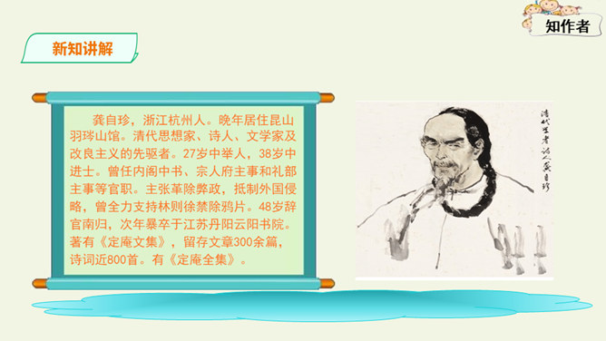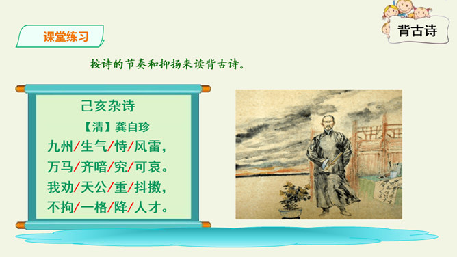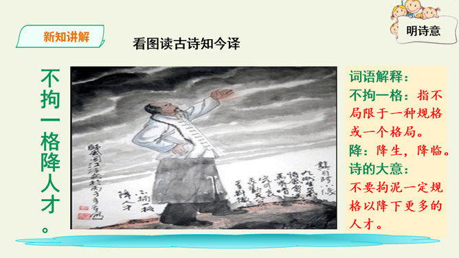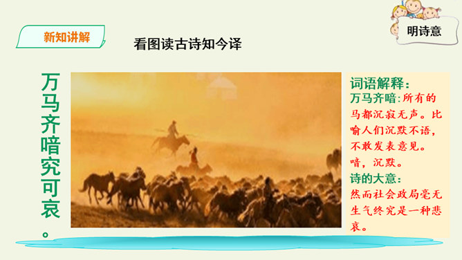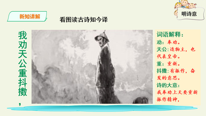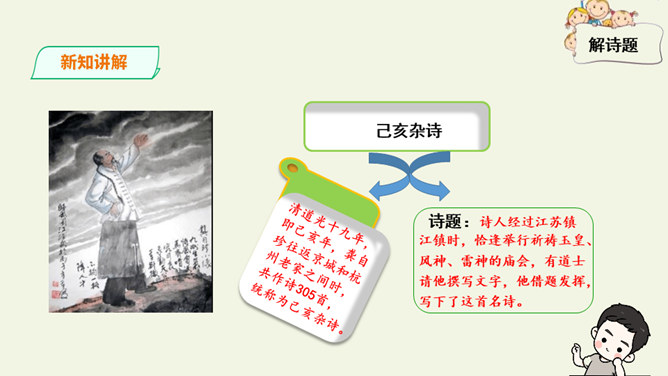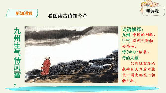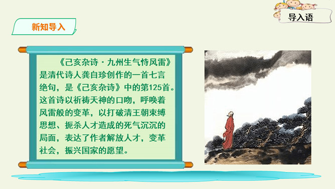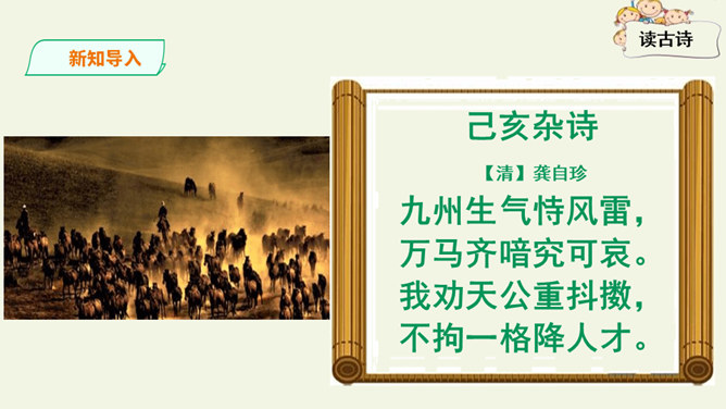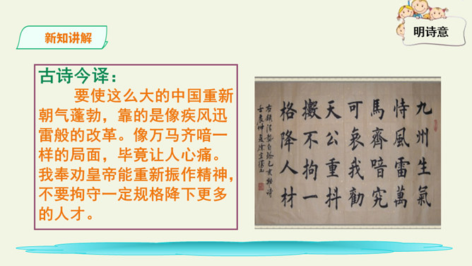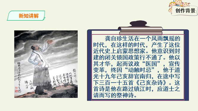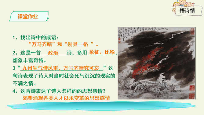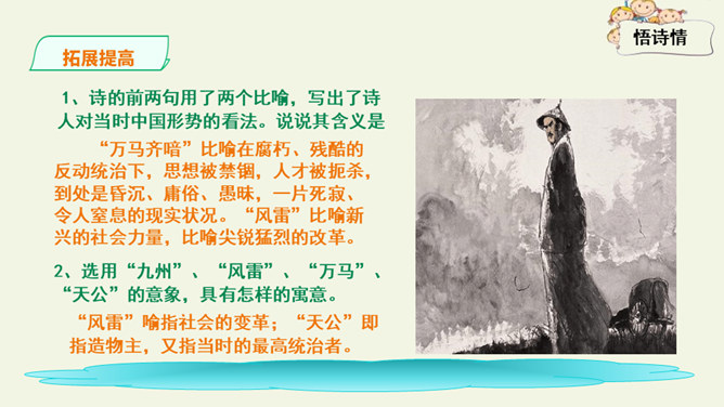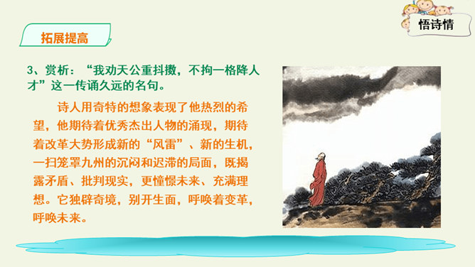 这是一首出色的政治诗。全诗层次清晰,共分三个层次:第一层,写了万马齐喑,朝野噤声的死气沉沉的现实社会。第二层,作者指出了要改变这种沉闷,腐朽的现状,就必须依靠风雷激荡般的巨大力量。暗喻必须经历波澜壮阔的社会变革才能使中国变得生机勃勃。第三层,作者认为这样的力量来源于人材,而朝庭所应该做的就是破格荐用人材,只有这样,中国才有希望。诗人用奇特的想象表现了他热烈的希望,他期待着优秀杰出人物的涌现。所属专题:己亥杂诗ppt。