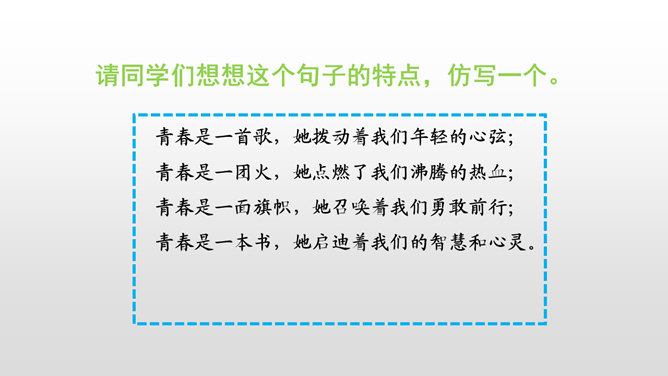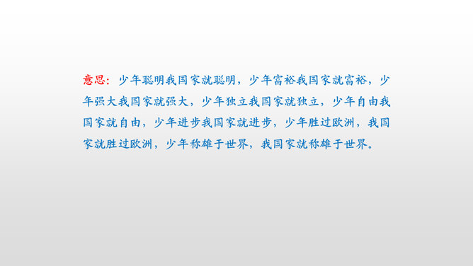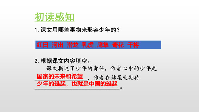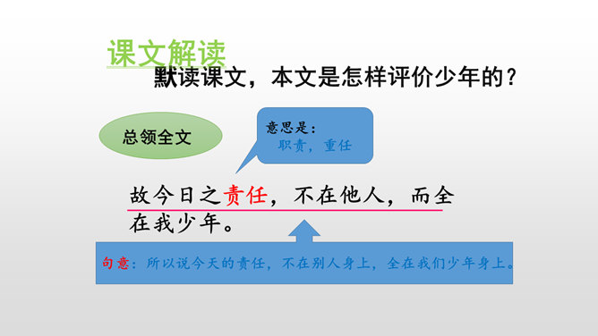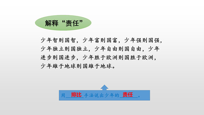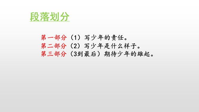 第一部分(1)写少年的责任。 第二部分(2)写少年是什么样子。第三部分(3到最后)期待少年的雄起。默读课文,本文是怎样评价少年的?请同学们想想这个句子的特点,仿写一个。思考:这样结尾有什么好处?将对少年的期待作为结尾,表达了作者对国家未来的深深期待,表达了作者的爱国之情,照应开头,深化主题。这句话是用排比来抒情,节奏和谐,显得感情洋溢、气势更为强烈。作者通过这种方式表达对少年的期待。所属专题:少年中国说ppt。