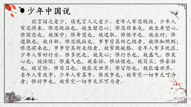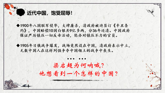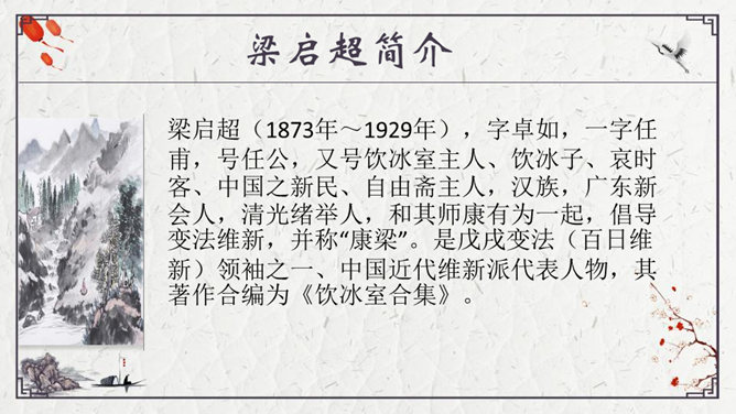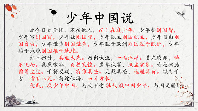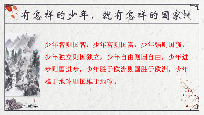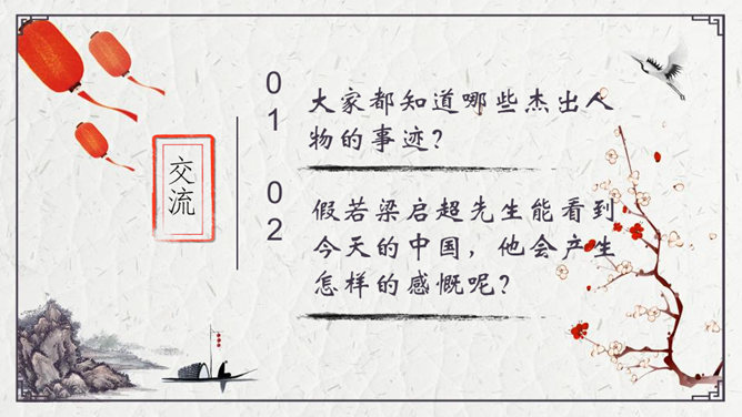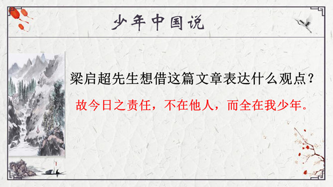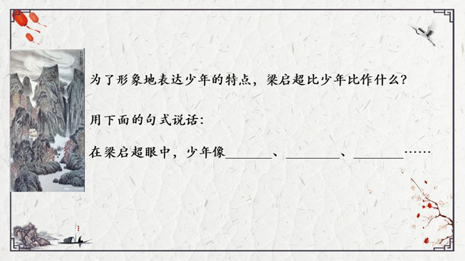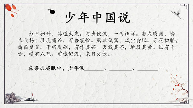 为了形象地表达少年的特点,梁启超比少年比作什么?梁启超为何呐喊?他想看到一个怎样的中国?大家都知道哪些杰出人物的事迹?假若梁启超先生能看到今天的中国,他会产生怎样的感慨呢?每个小组完成一份手抄报,主题为近百年来的杰出人物。内容自选,报纸名称自定。所属专题:少年中国说ppt。