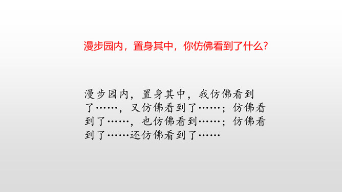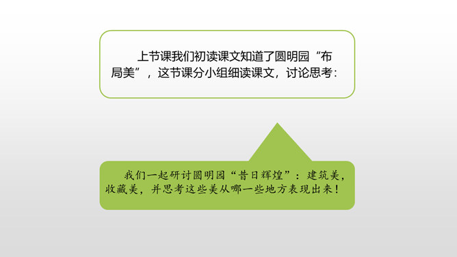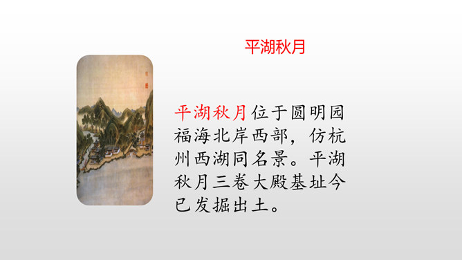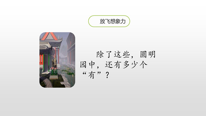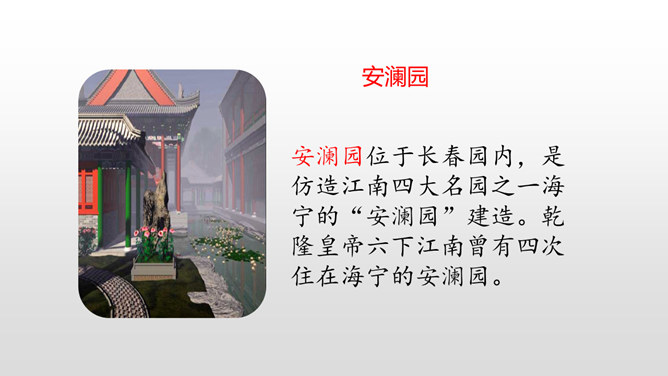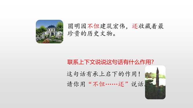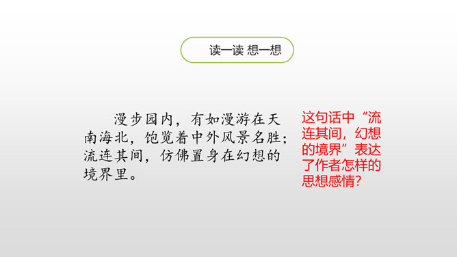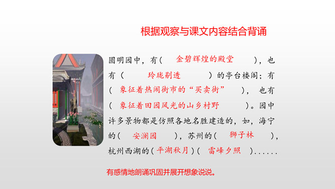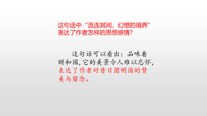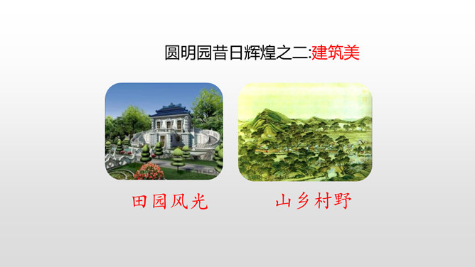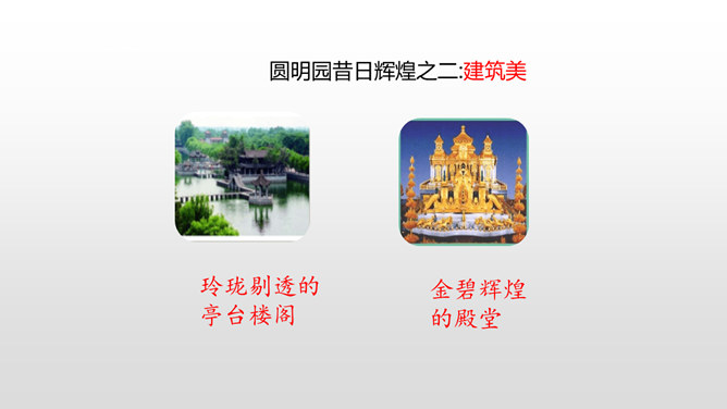 上节课我们初读课文知道了圆明园“布局美”,这节课分小组细读课文,讨论思考:我们一起研讨圆明园“昔日辉煌”:建筑美,收藏美,并思考这些美从哪一些地方表现出来!这句话中“流连其间,幻想的境界”表达了作者怎样的思想感情?这句话可以看出:品味着颐和园,它的美景令人难以忘怀,表达了作者对昔日圆明园的赞美与留念。先展示收藏的珍奇异宝图,然后请同学们说出感受。昔日的圆明园这么美丽,可是遭到侵略者的毁灭,怎样毁灭的?看书说一说。所属专题:圆明园的毁灭ppt。