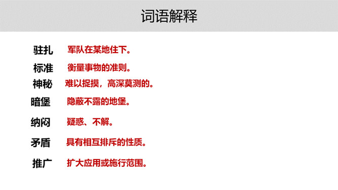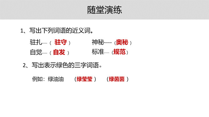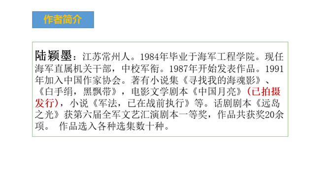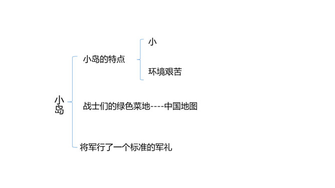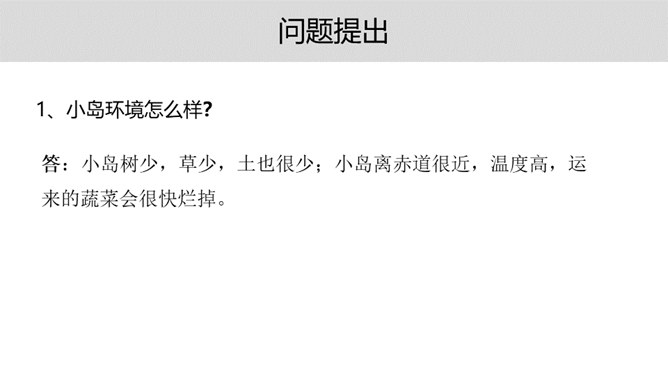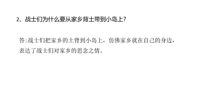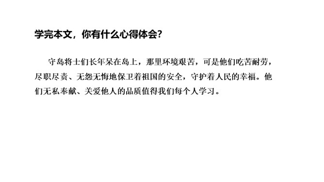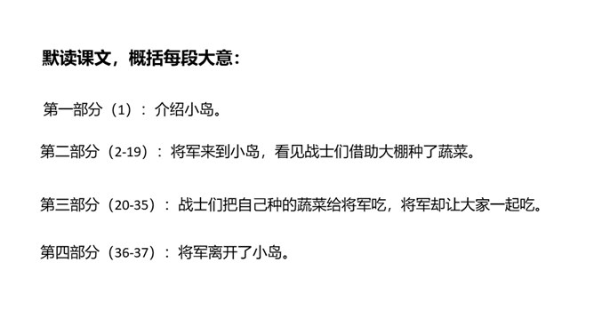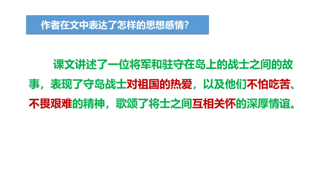 快速浏览课文,边读边想:1.作者在文中表达了怎样的思想感情?2.概括每段的大意。作者在文中表达了怎样的思想感情?课文讲述了一位将军和驻守在岛上的战士之间的故事,表现了守岛战士对祖国的热爱,以及他们不怕吃苦、不畏艰难的精神,歌颂了将士之间互相关怀的深厚情谊。1、小岛环境怎么样?答:小岛树少,草少,土也很少;小岛离赤道很近,温度高,运来的蔬菜会很快烂掉。所属专题:小岛ppt。