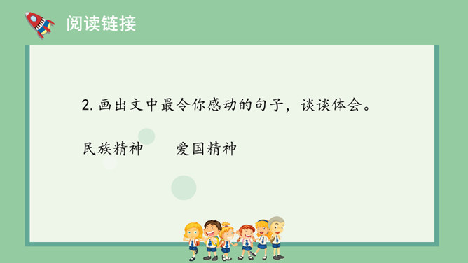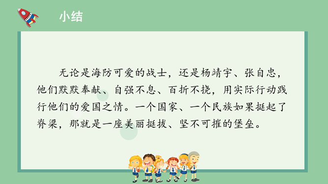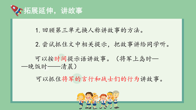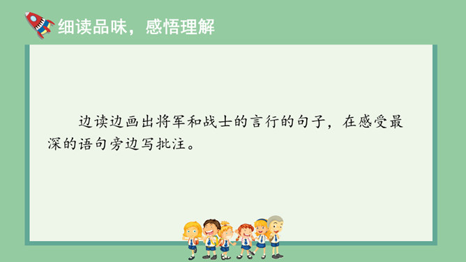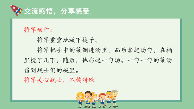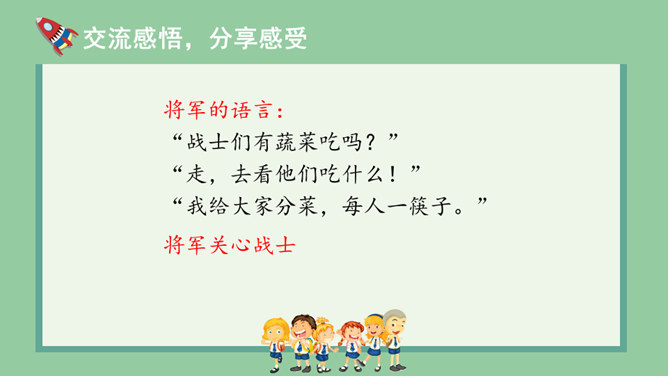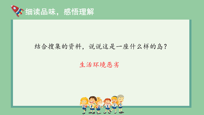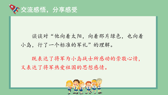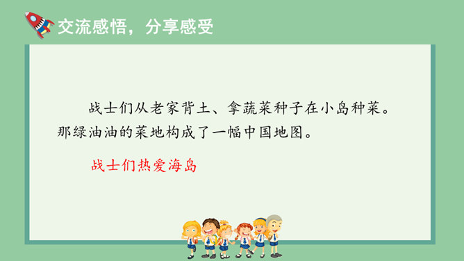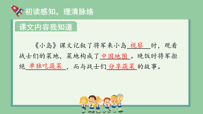 自由读课文:读准字音,难读的地方多读几遍。结合搜集的资料,说说这是一座什么样的岛?边读边画出将军和战士的言行的句子,在感受最深的语句旁边写批注。既表达了将军为小岛战士所感动的崇敬心情,又表达了将军热爱祖国的思想感情。回顾第三单元换人称讲故事的方法。尝试抓住文中相关提示,把故事讲给同学听。可以按时间提示语讲故事。(将军上岛时——晚饭时——清晨)可以抓住将军的言行和战士们的行为讲故事。所属专题:小岛ppt。
