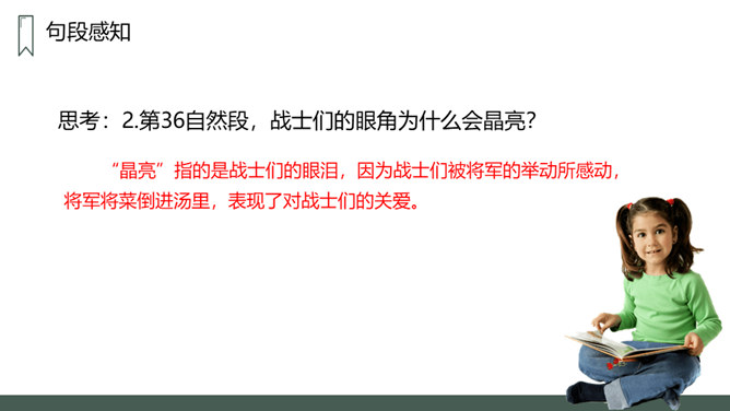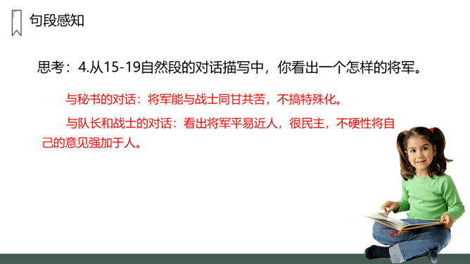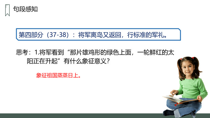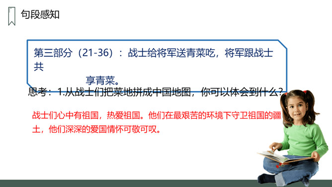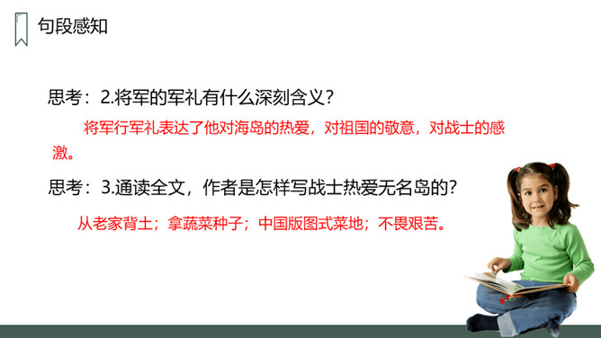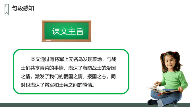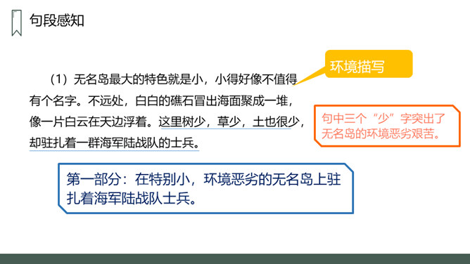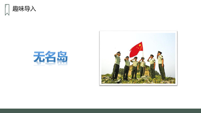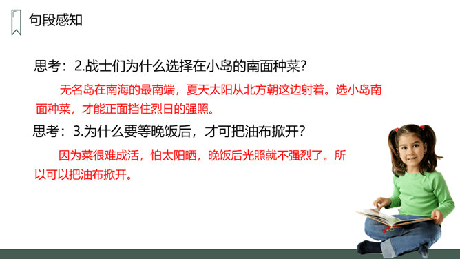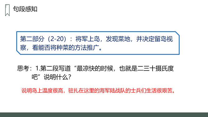 第一部分:在特别小,环境恶劣的无名岛上驻扎着海军陆战队士兵。句中三个“少”字突出了无名岛的环境恶劣艰苦。第二部分(2-20):将军上岛,发现菜地,并决定留岛视察,看能否将种菜的方法推广。思考:1.第二段写道“最凉快的时候,也就是二三十摄氏度吧”说明什么?说明岛上温度很高,驻扎在这里的海军陆战队的士兵们生活很艰苦。思考:2.战士们为什么选择在小岛的南面种菜?思考:3.为什么要等晚饭后,才可把油布掀开?所属专题:小岛ppt。