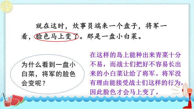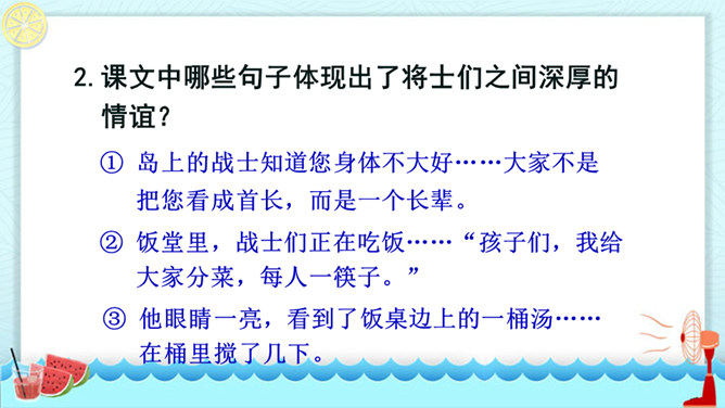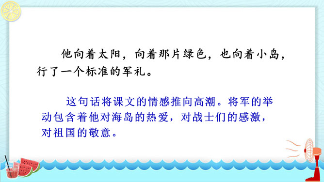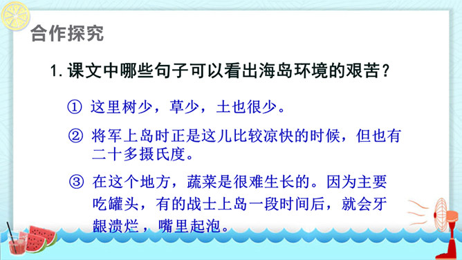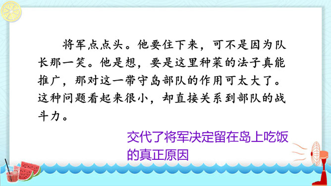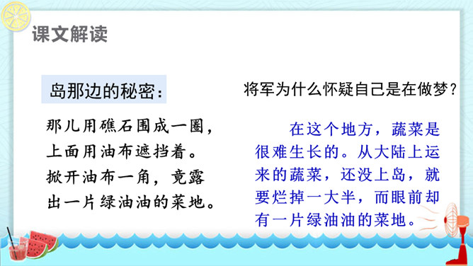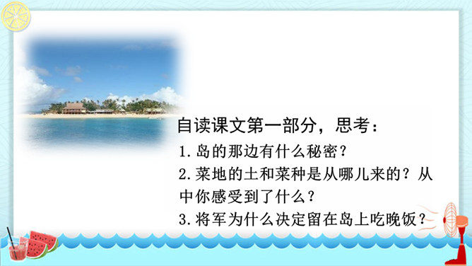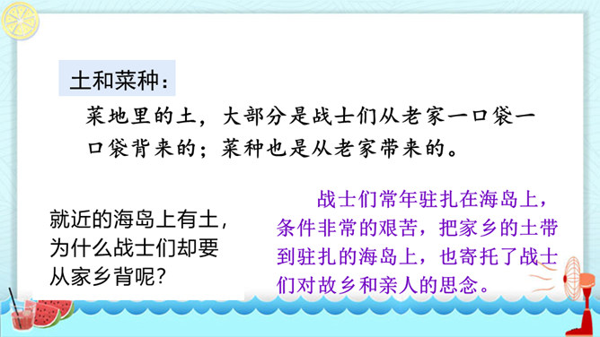 自读课文第一部分,思考:岛的那边有什么秘密?菜地的土和菜种是从哪儿来的?从中你感受到了什么?将军为什么决定留在岛上吃晚饭?将军为什么怀疑自己是在做梦?在这个地方,蔬菜是很难生长的。从大陆上运来的蔬菜,还没上岛,就要烂掉一大半,而眼前却有一片绿油油的菜地。就近的海岛上有土,为什么战士们却要从家乡背呢?战士们常年驻扎在海岛上,条件非常的艰苦,把家乡的土带到驻扎的海岛上,也寄托了战士们对故乡和亲人的思念。所属专题:小岛ppt。