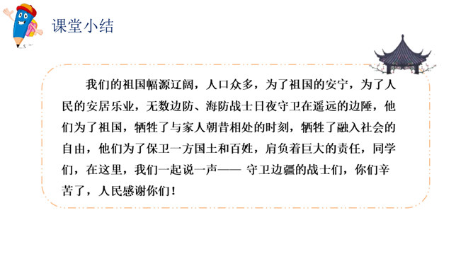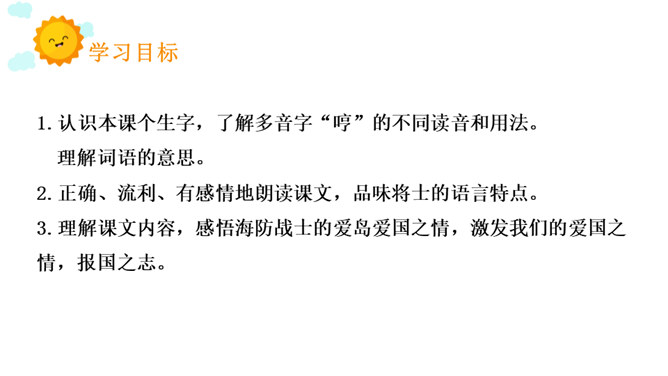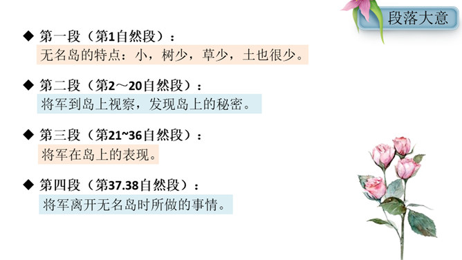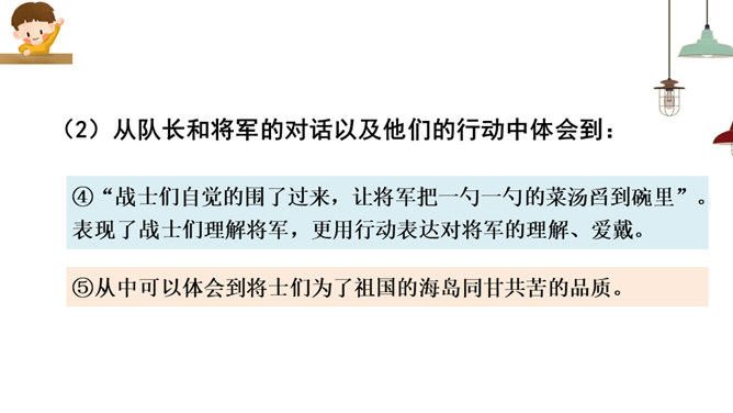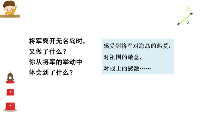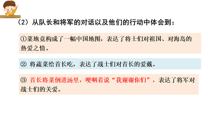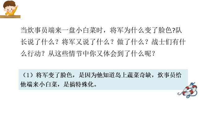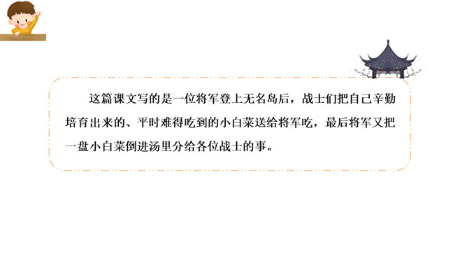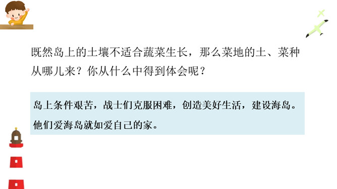 这篇课文写的是一位将军登上无名岛后,战士们把自己辛勤培育出来的、平时难得吃到的小白菜送给将军吃,最后将军又把一盘小白菜倒进汤里分给各位战士的事。既然岛上的土壤不适合蔬菜生长,那么菜地的土、菜种从哪儿来?你从什么中得到体会呢?岛上条件艰苦,战士们克服困难,创造美好生活,建设海岛。他们爱海岛就如爱自己的家。将军本来是定了赶回舰上吃晚饭的,可他为什么决定不光在岛上吃晚饭,还要吃第二天的早饭呢?所属专题:小岛ppt。