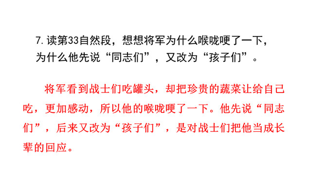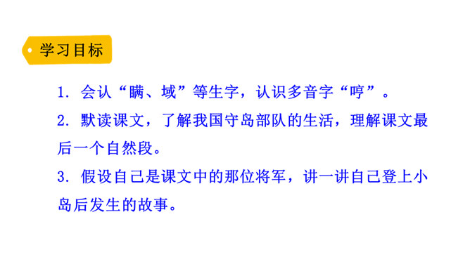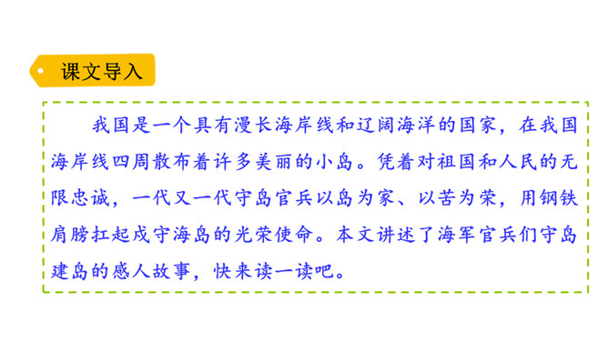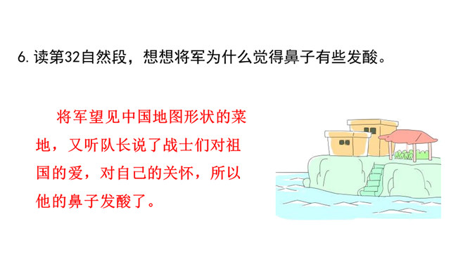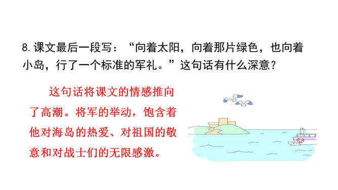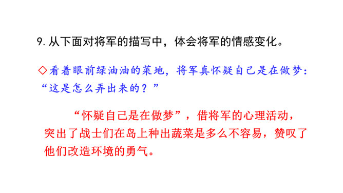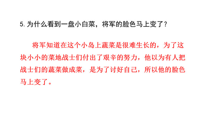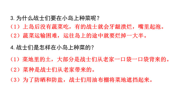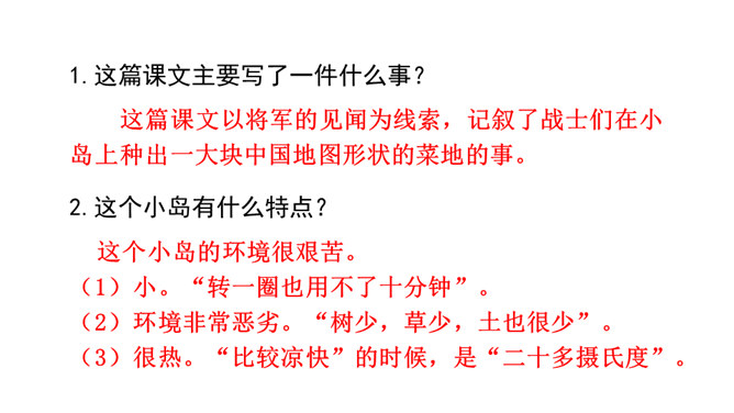 1.这篇课文主要写了一件什么事?这篇课文以将军的见闻为线索,记叙了战士们在小岛上种出一大块中国地图形状的菜地的事。2.这个小岛有什么特点?这个小岛的环境很艰苦。(1)小。“转一圈也用不了十分钟”。(2)环境非常恶劣。“树少,草少,土也很少”。(3)很热。“比较凉快”的时候,是“二十多摄氏度”。3.为什么战士们要在小岛上种菜呢?(1)上岛后没有蔬菜吃,有的战士就会牙龈溃烂,嘴里起泡。(2)蔬菜运输困难,运往岛上的途中就要烂掉一大半。4.战士们是怎样在小岛上种菜的?(1)菜地里的土,大部分是战士们从老家一口袋一口袋背来的。所属专题:小岛ppt。