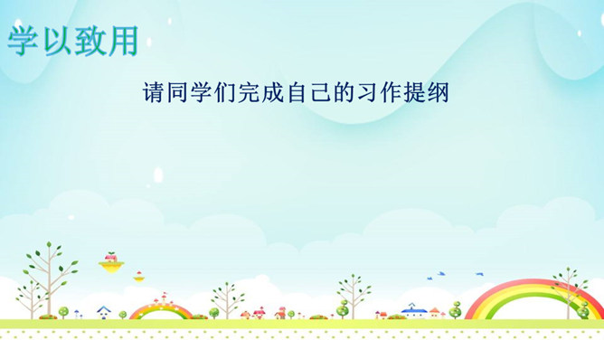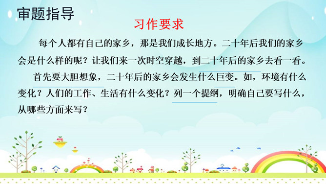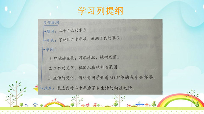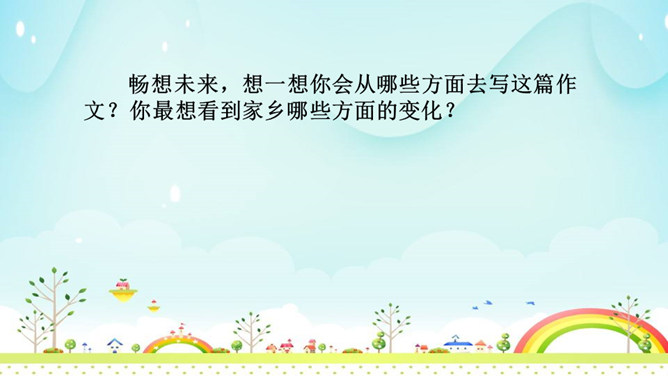 每个人都有自己的家乡,那是我们成长地方。二十年后我们的家乡会是什么样的呢?让我们来一次时空穿越,到二十年后的家乡去看一看。首先要大胆想象,二十年后的家乡会发生什么巨变。如,环境有什么变化?人们的工作、生活有什么变化?列一个提纲,明确自己要写什么,从哪些方面来写?畅想未来,想一想你会从哪些方面去写这篇作文?你最想看到家乡哪些方面的变化?请同学们完成自己的习作提纲。所属专题:二十年后的家乡ppt。