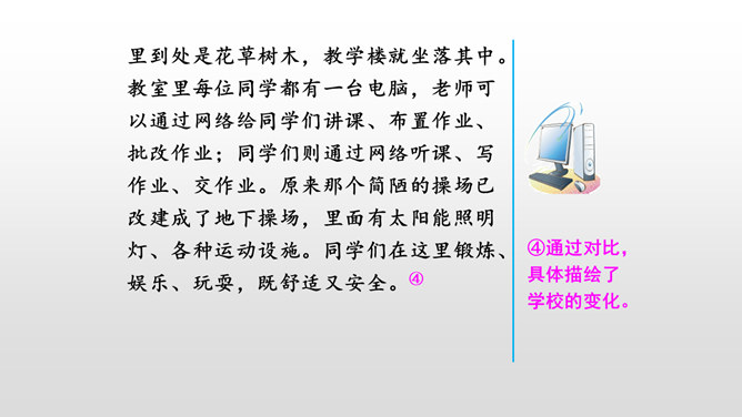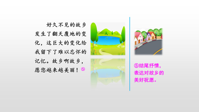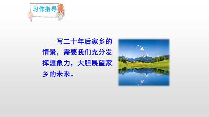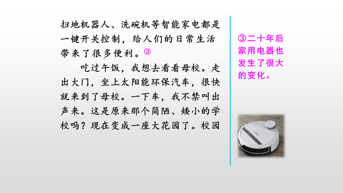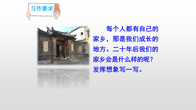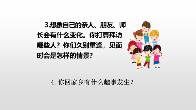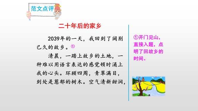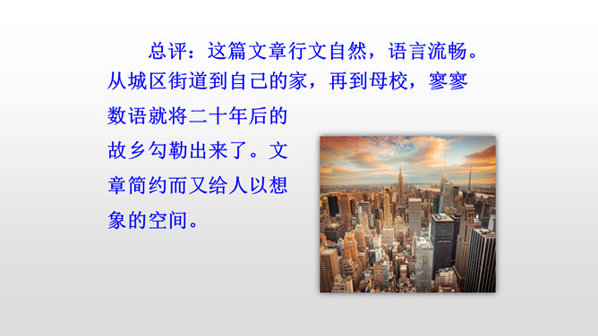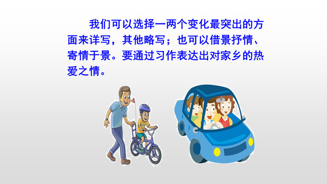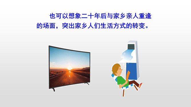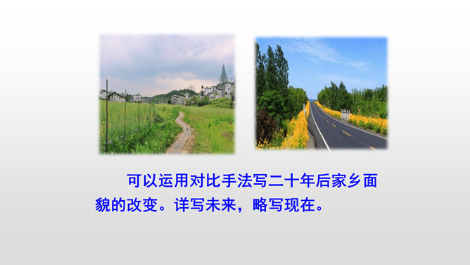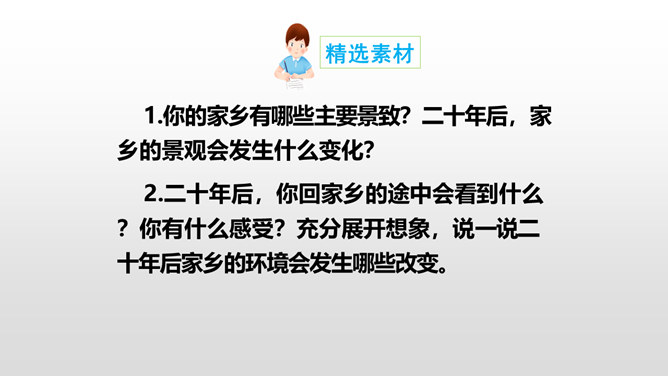 1.你的家乡有哪些主要景致?二十年后,家乡的景观会发生什么变化?2.二十年后,你回家乡的途中会看到什么?你有什么感受?充分展开想象,说一说二十年后家乡的环境会发生哪些改变。3.想象自己的亲人、朋友、师长会有什么变化。你打算拜访哪些人?你们久别重逢,见面时会是怎样的情景?4.你回家乡有什么趣事发生?总评:这篇文章行文自然,语言流畅。从城区街道到自己的家,再到母校,寥寥数语就将二十年后的故乡勾勒出来了。所属专题:二十年后的家乡ppt。