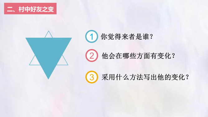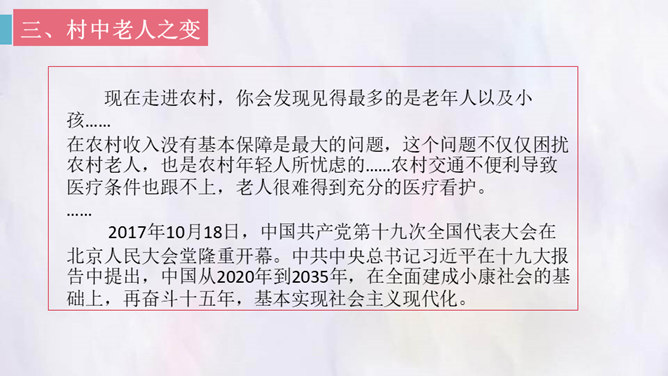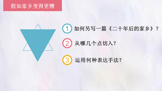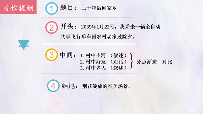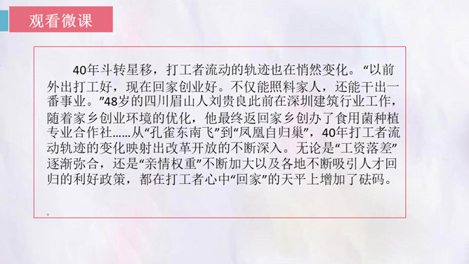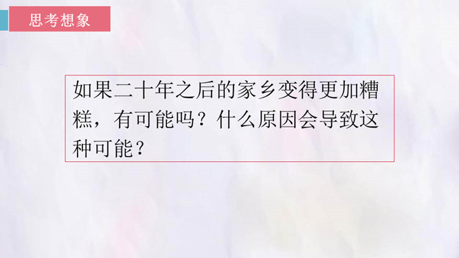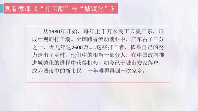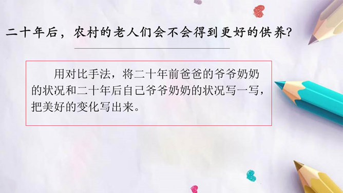 观影对话,激发兴趣。观看微课《“打工潮”与“城镇化”》。老家好?读书的城市好?村中小河之变。村中好友之变。你觉得来者是谁?他会在哪些方面有变化?采用什么方法写出他的变化?想象中的小康加现代化的中国会是一个怎样的景象?二十年后,农村的老人们会不会得到更好的供养?用对比手法,将二十年前爸爸的爷爷奶奶的状况和二十年后自己爷爷奶奶的状况写一写,把美好的变化写出来。所属专题:二十年后的家乡ppt。