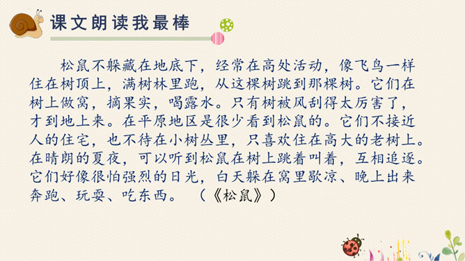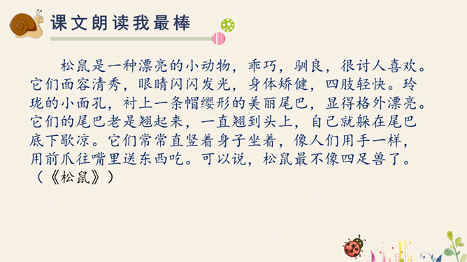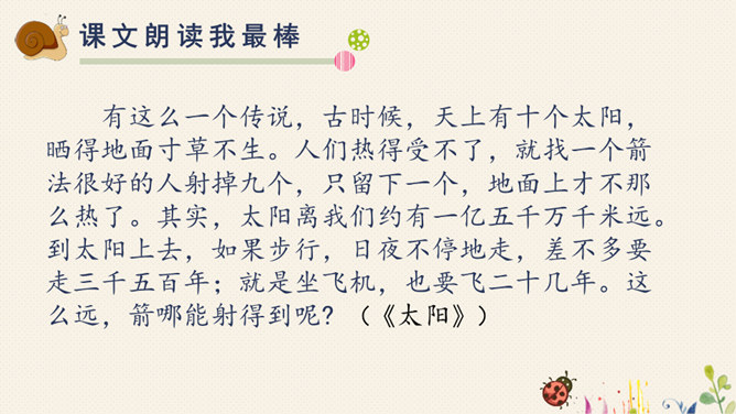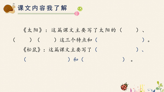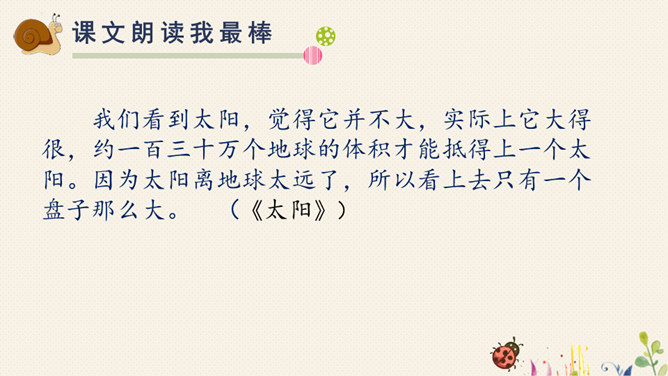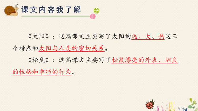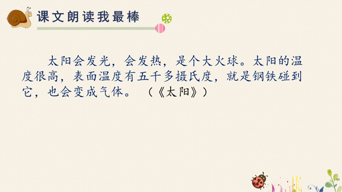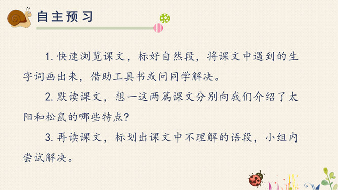 对于自己在预习过程中,遇到的不理解的词语、句子,或者其他有疑问的地方,随时记录下来,能小组间解决的当堂解决,解决不了的在接下来的学习过程中逐一解决。1.快速浏览课文,标好自然段,将课文中遇到的生字词画出来,借助工具书或问同学解决。2.默读课文,想一这两篇课文分别向我们介绍了太阳和松鼠的哪些特点?3.再读课文,标划出课文中不理解的语段,小组内尝试解决。所属专题:太阳ppt。