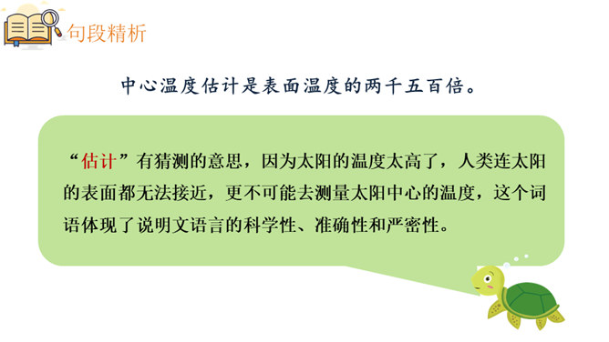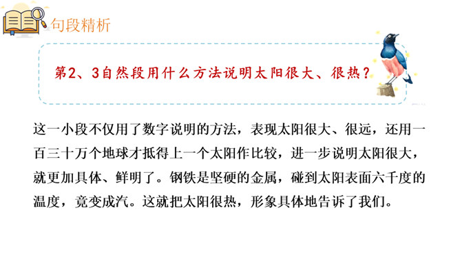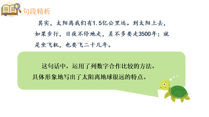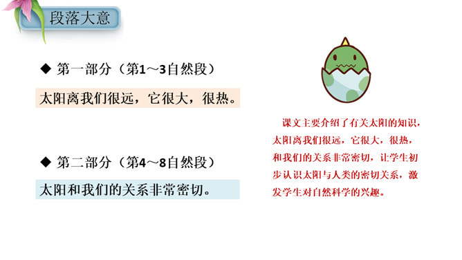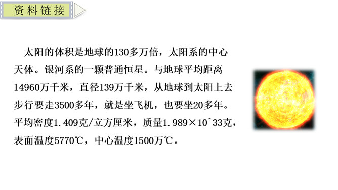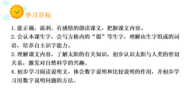 1.能正确、流利、有感情的朗读课文,把握课文内容。2.会认本课生字,会写方格内的“摄”等生字,理解由生字组成的词语,培养自主识字能力。3.理解课文内容,了解太阳的有关知识,初步认识太阳与人类的密切关系,激发对自然科学的兴趣。4.初步学习阅读说明文,体会数字说明和比较说明的作用,并初步学习用数字说明问题的方法。课文主要介绍了有关太阳的知识,太阳离我们很远,它很大,很热,和我们的关系非常密切,让学生初步认识太阳与人类的密切关系,激发学生对自然科学的兴趣。所属专题:太阳ppt。