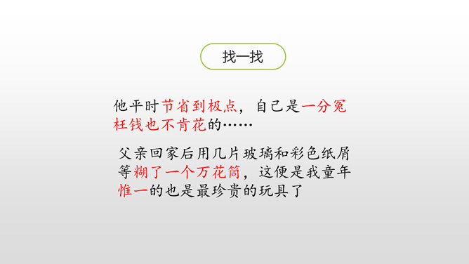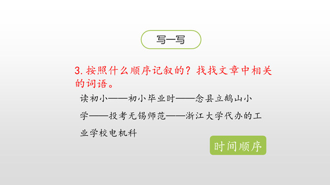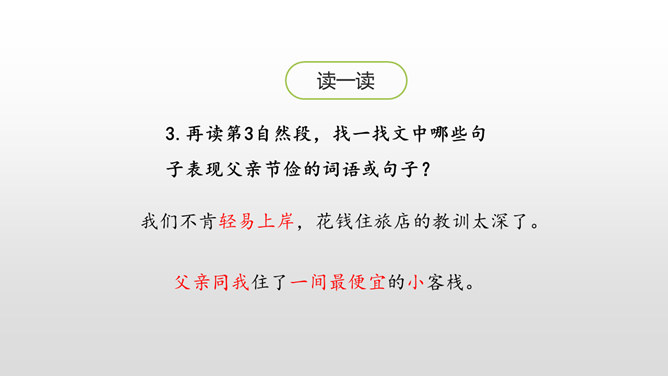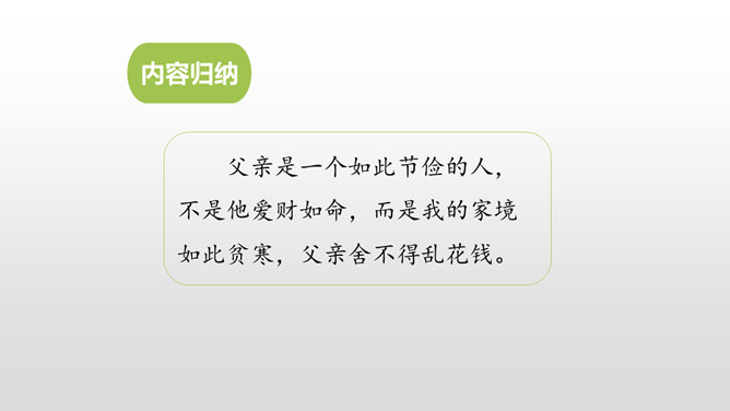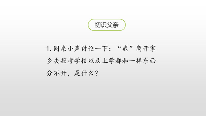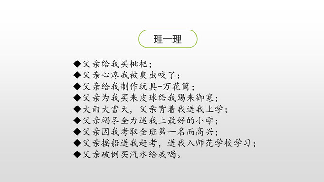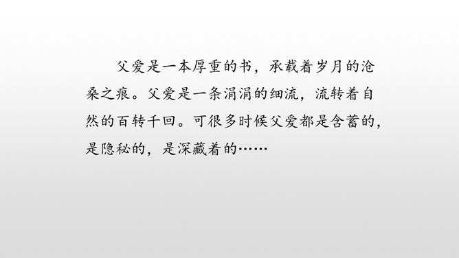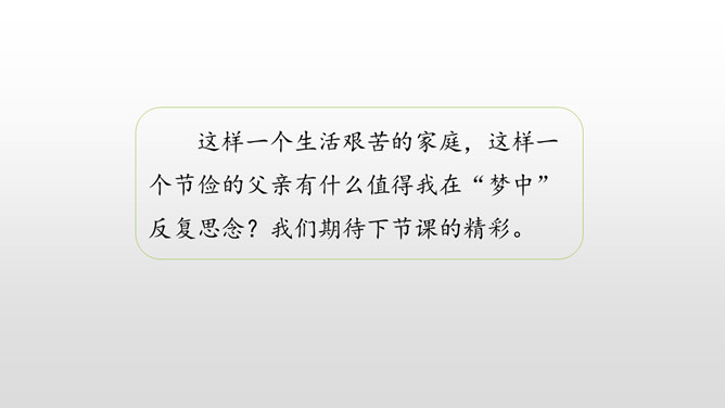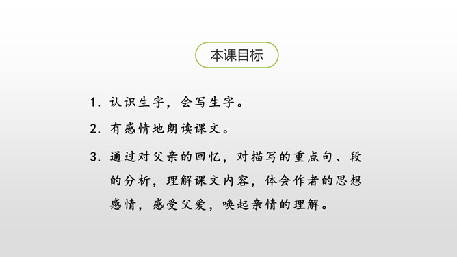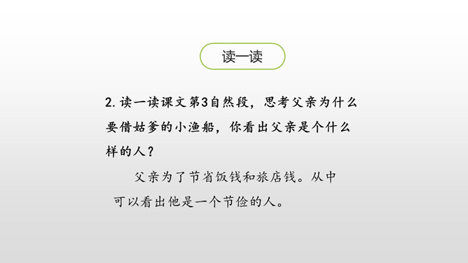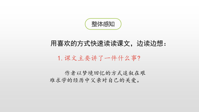 认识生字,会写生字。有感情地朗读课文。通过对父亲的回忆,对描写的重点句、段的分析,理解课文内容,体会作者的思想感情,感受父爱,唤起亲情的理解。用喜欢的方式快速读读课文,边读边想:1.课文主要讲了一件什么事?作者以梦境回忆的方式追叙在艰难求学的经历中父亲对自己的关爱。按照什么顺序记叙的?找找文章中相关的词语。读初小—初小毕业时—念县立鹅山小学—投考无锡师范—浙江大学代办的工业学校电机科。所属专题:父爱之舟ppt。