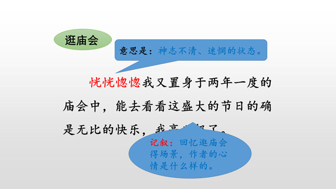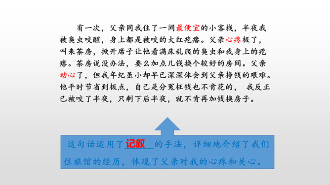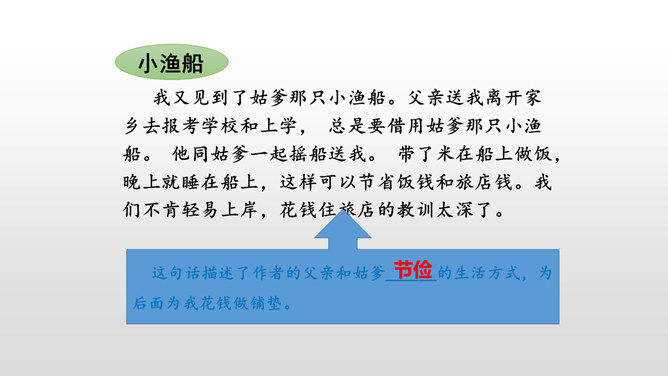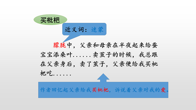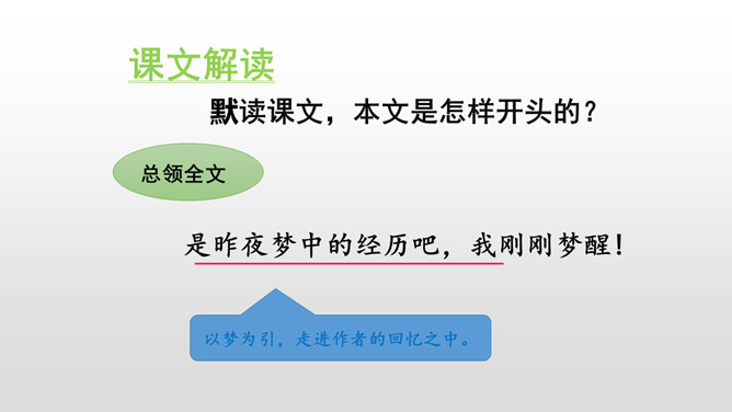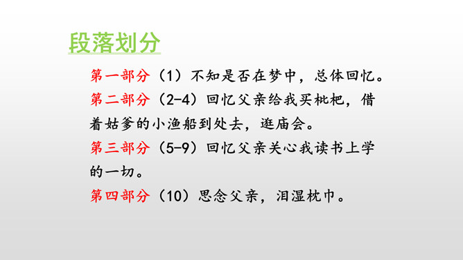 课文描述了父亲对作者无微不至的爱,作者以梦境作为开头回忆往事,作者又是以从梦境中醒来枕边一片湿作结尾,感悟父爱深沉。默读课文,说说在“我”的梦中出现了哪些难忘的场景,哪个场景给你的印象最深。第一部分(1)不知是否在梦中,总体回忆。第二部分(2-4)回忆父亲给我买枇杷,借着姑爹的小渔船到处去,逛庙会。第三部分(5-9)回忆父亲关心我读书上学的一切。第四部分(10)思念父亲,泪湿枕巾。所属专题:父爱之舟ppt。