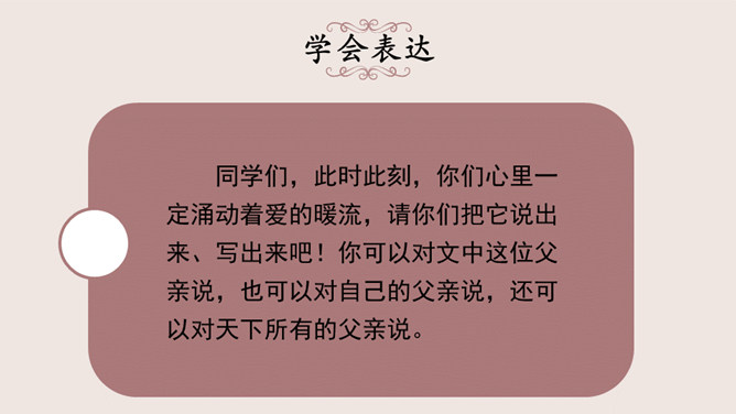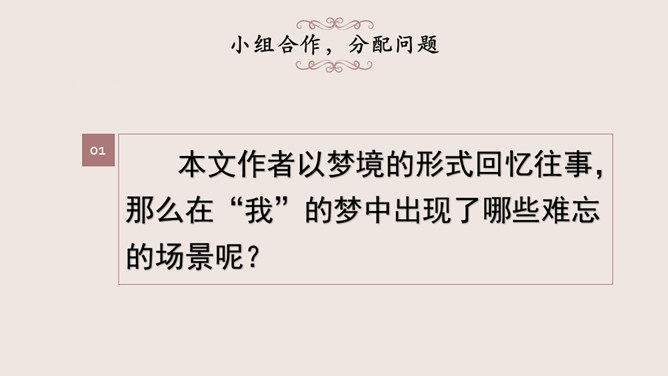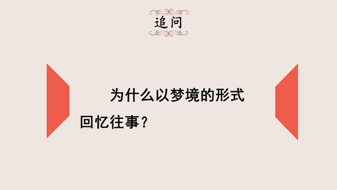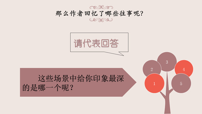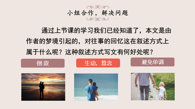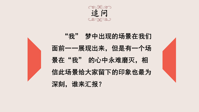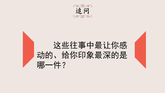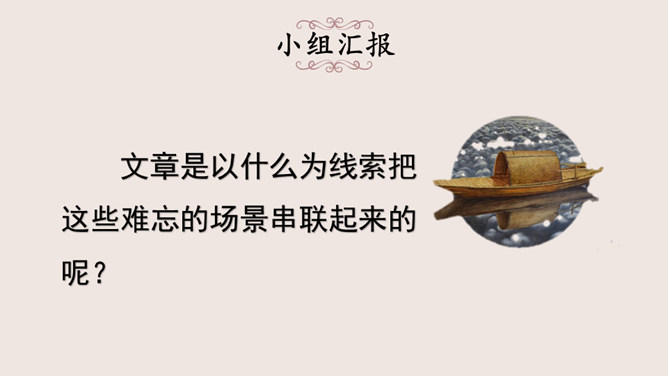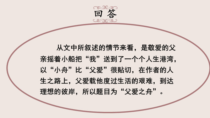 本文作者以梦境的形式回忆往事,那么在“我”的梦中出现了哪些难忘的场景呢?通过上节课的学习我们已经知道了,本文是由作者的梦境引起的,对往事的回忆这在叙述方式上属于什么呢?这种叙述方式写文有何好处呢?这些场景中给你印象最深的是哪一个呢?这些往事中最让你感动的、给你印象最深的是哪一件?梦中出现的场景在我们面前一一展现出来,但是有一个场景在“我” 的心中永难磨灭,相信此场景给大家留下的印象也最为深刻,谁来汇报?所属专题:父爱之舟ppt。