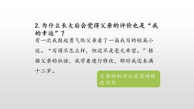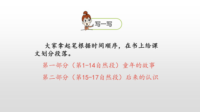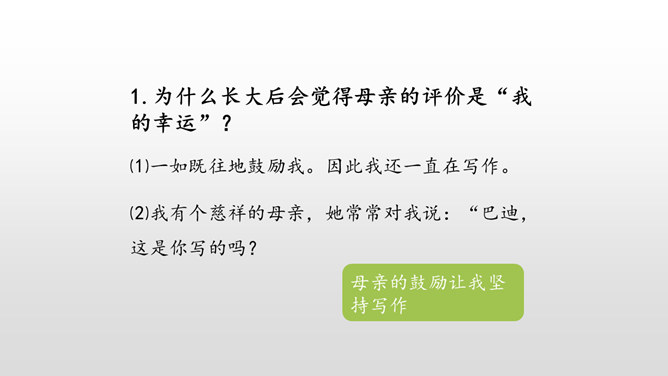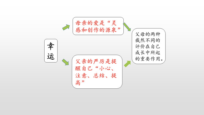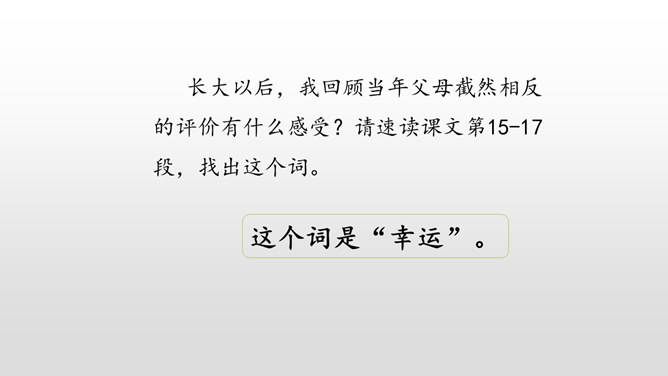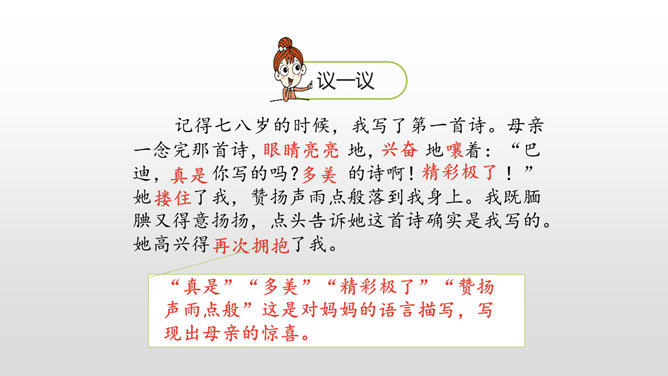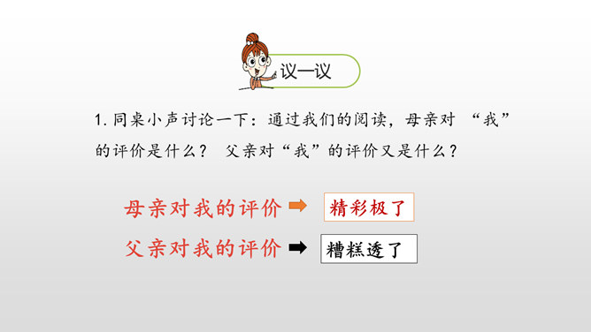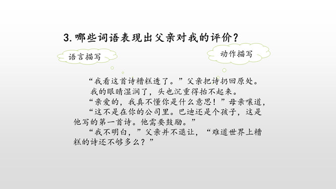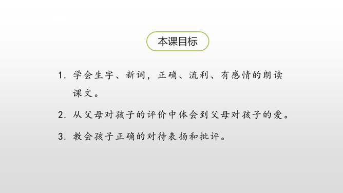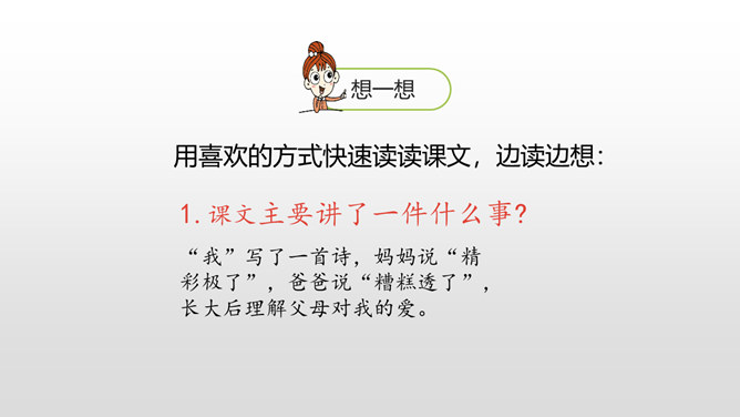 学会生字、新词,正确、流利、有感情的朗读课文。从父母对孩子的评价中体会到父母对孩子的爱。教会孩子正确的对待表扬和批评。用喜欢的方式快速读读课文,边读边想:课文主要讲了一件什么事?“我”写了一首诗,妈妈说“精彩极了”,爸爸说“糟糕透了”,长大后理解父母对我的爱。速读课文,想一想:文章按什么顺序写的?课文按照时间顺序写的。大家拿起笔根据时间顺序,在书上给课文划分段落。所属专题:精彩极了和糟糕透了ppt。