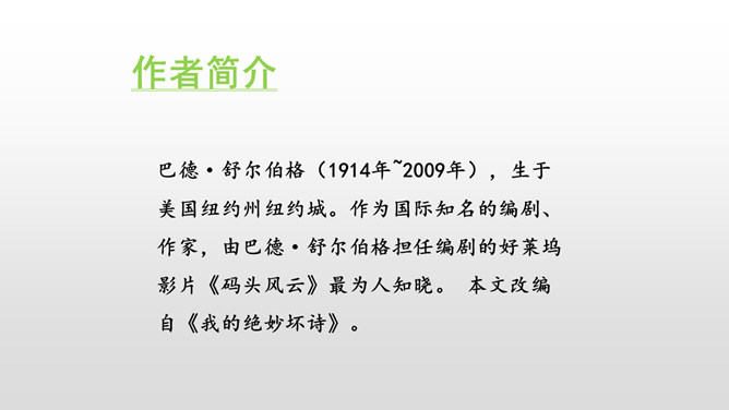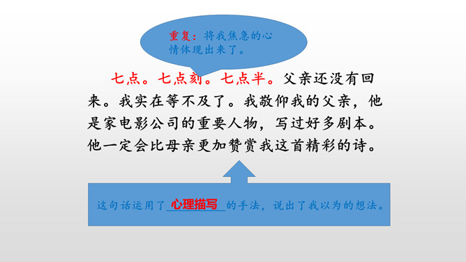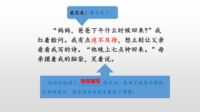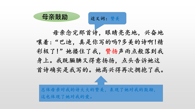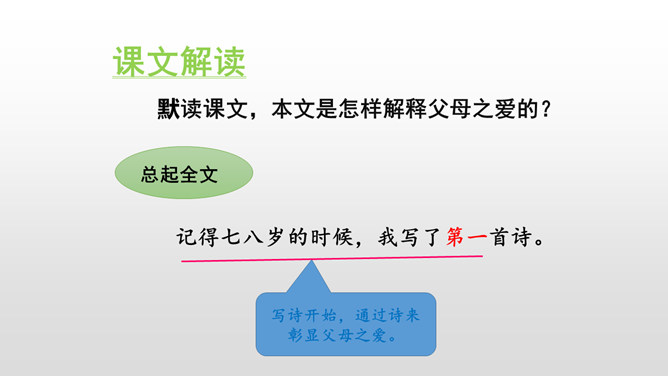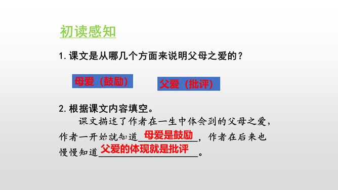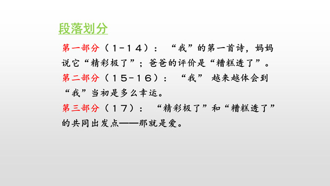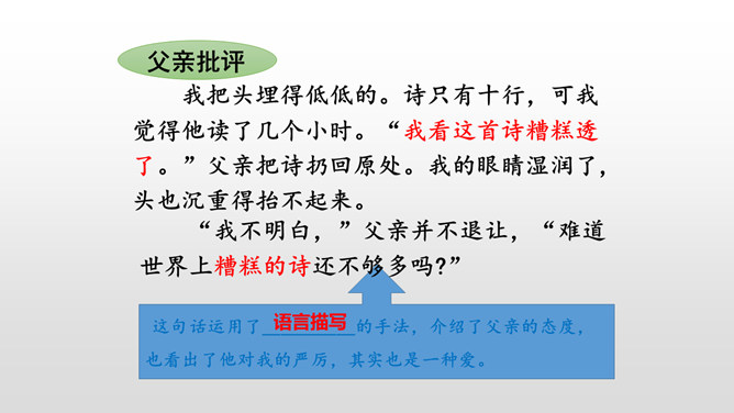 总体母亲对我的诗大大的赞美,表现了她对我的鼓励,这也体现了她对我的爱。这句话运用了语言描写的手法,表现了我急于得到父亲的肯定,这也为后来的发展做了铺垫。结尾:无论是鼓励还是批评,都是爱的体现,作者的父母之爱中前行。这句话真实地写出了“我”当时紧张的心理活动。把描写母亲对我的赞扬的句子抄下来。课下回忆父母对自己的爱,请你以小短文的形式展示一下,写出父母对自己的关心爱护之情。所属专题:精彩极了和糟糕透了ppt。