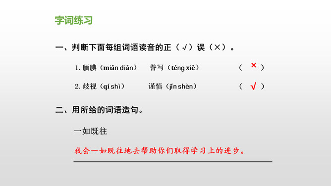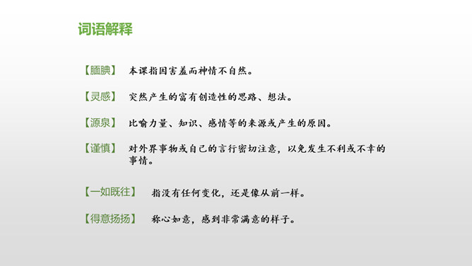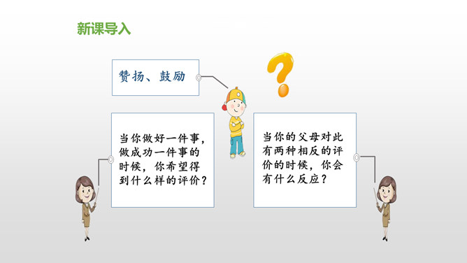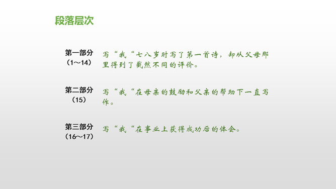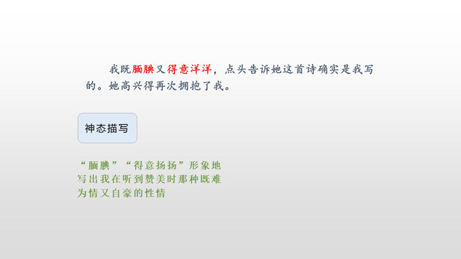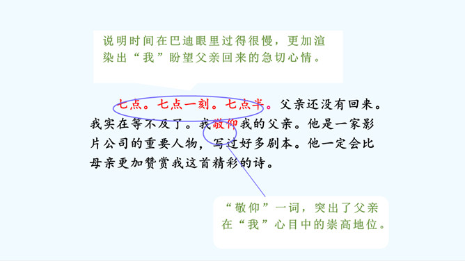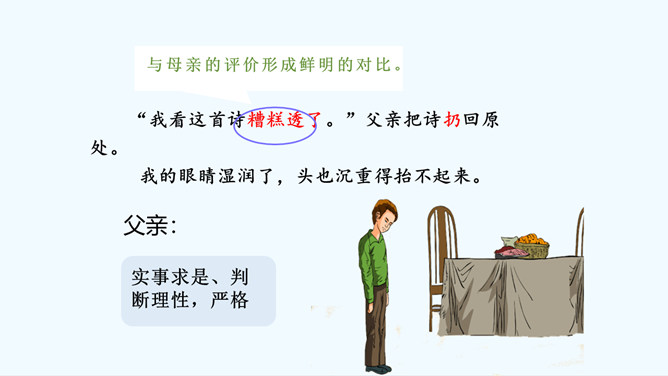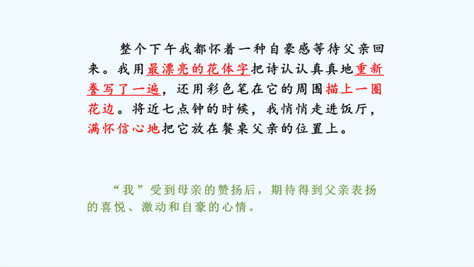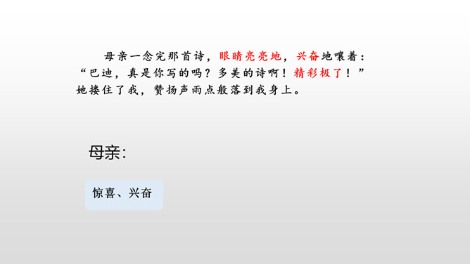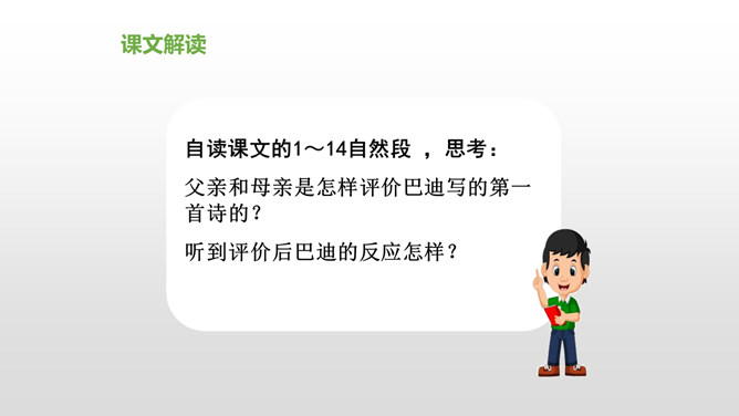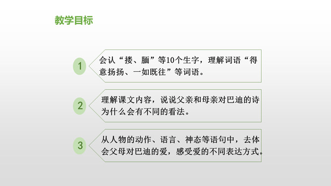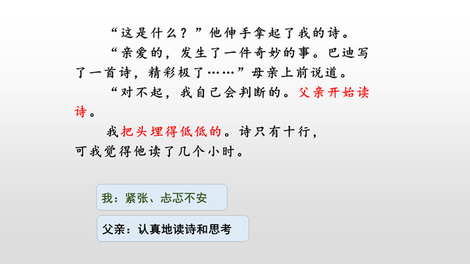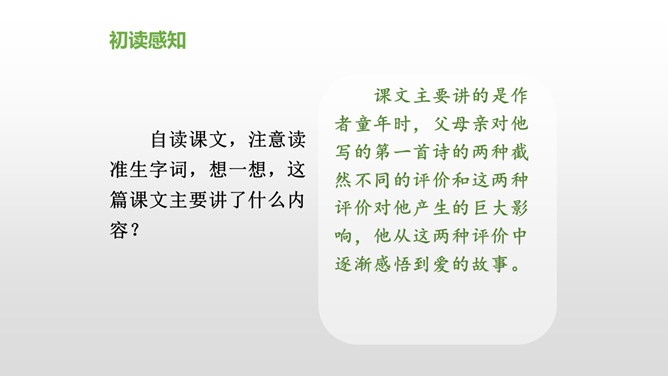 会认“搂、腼”等10个生字,理解词语“得意扬扬、一如既往”等词语。理解课文内容,说说父亲和母亲对巴迪的诗为什么会有不同的看法。从人物的动作、语言、神态等语句中,去体会父母对巴迪的爱,感受爱的不同表达方式。自读课文,注意读准生字词,想一想,这篇课文主要讲了什么内容?课文主要讲的是作者童年时,父母亲对他写的第一首诗的两种截然不同的评价和这两种评价对他产生的巨大影响,他从这两种评价中逐渐感悟到爱的故事。父亲和母亲是怎样评价巴迪写的第一首诗的?听到评价后巴迪的反应怎样?所属专题:精彩极了和糟糕透了ppt。