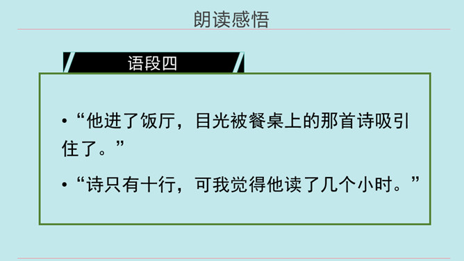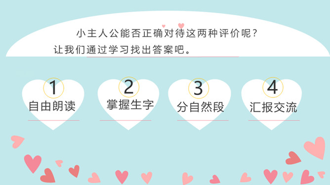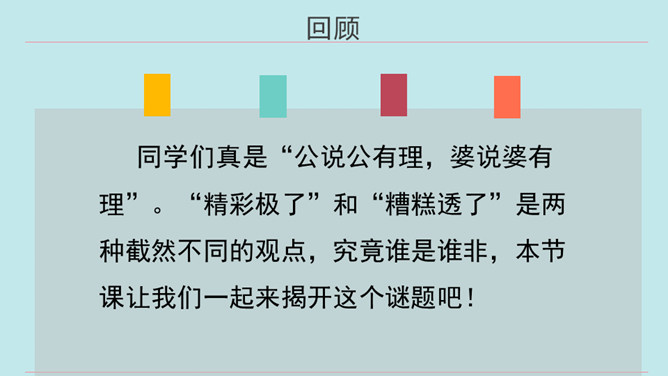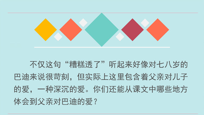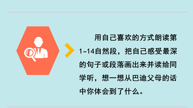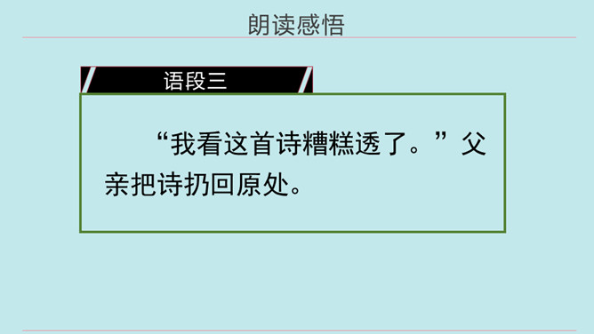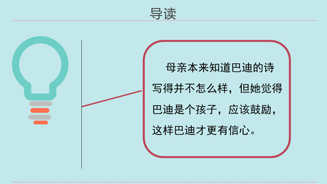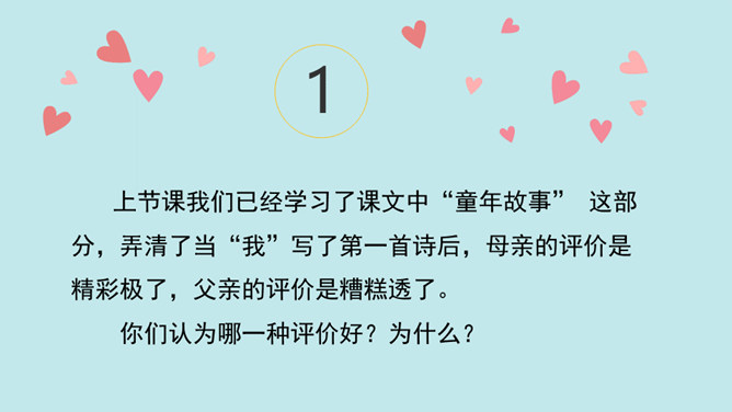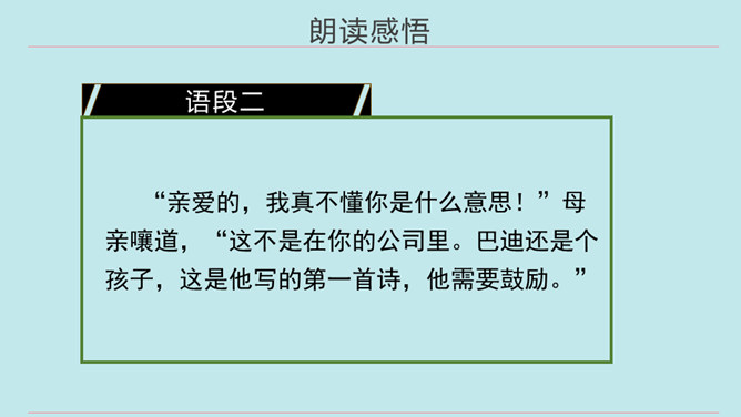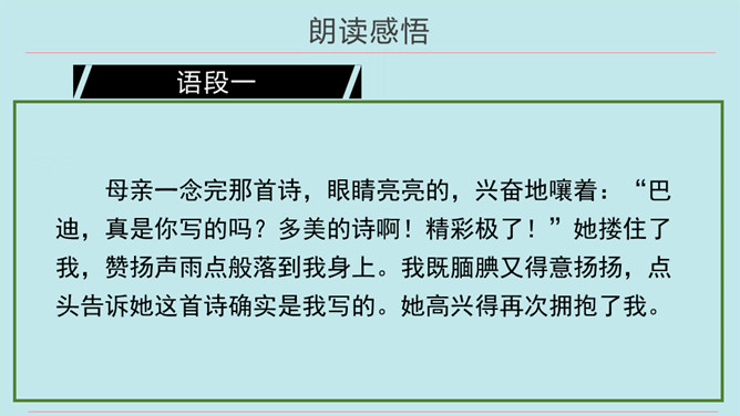 同学们,当你们拿着一件自认为完成得不错的作品,让爸爸、妈妈欣赏时,他们是怎么说的?又是怎么做的?今天我们要学的这篇课文中的小主人公写了一首诗,妈妈的评价是“精彩极了”,爸爸的评价却是“糟糕透了”,这到底是怎么回事呢?用自己喜欢的方式朗读第1~14自然段,把自己感受最深的句子或段落画出来并读给同学听,想一想从巴迪父母的话中你体会到了什么。所属专题:精彩极了和糟糕透了ppt。