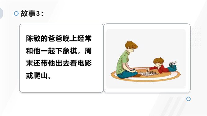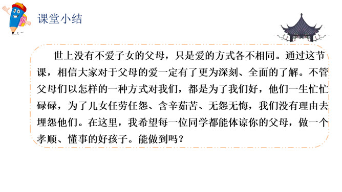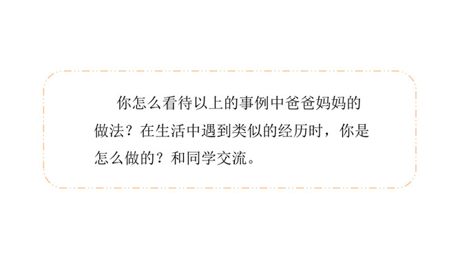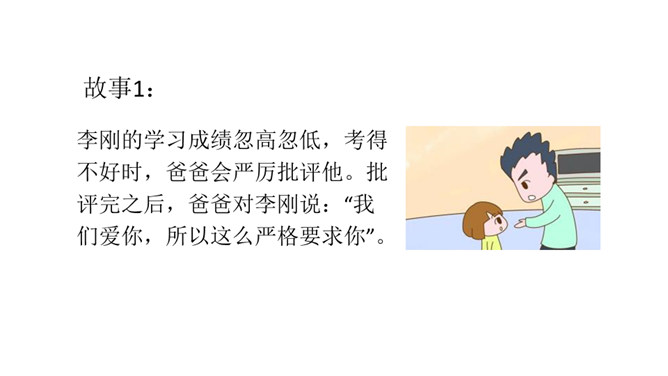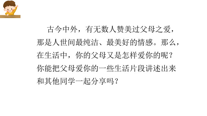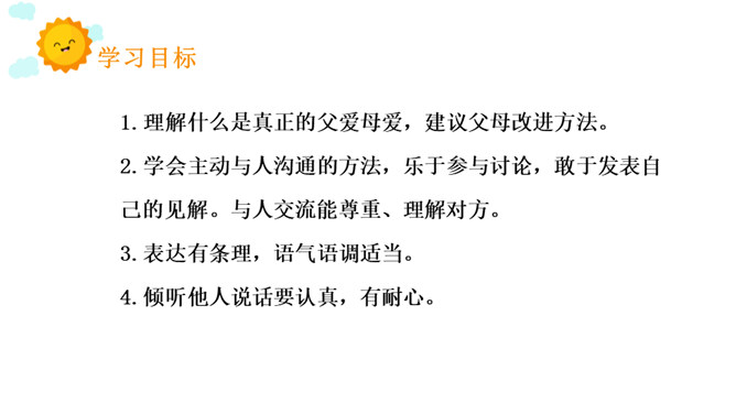 1.理解什么是真正的父爱母爱,建议父母改进方法。2.学会主动与人沟通的方法,乐于参与讨论,敢于发表自己的见解。与人交流能尊重、理解对方。3.表达有条理,语气语调适当。4.倾听他人说话要认真,有耐心。古今中外,有无数人赞美过父母之爱,那是人世间最纯洁、最美好的情感。那么,在生活中,你的父母又是怎样爱你的呢?你能把父母爱你的一些生活片段讲述出来和其他同学一起分享吗?所属专题:父母之爱ppt。