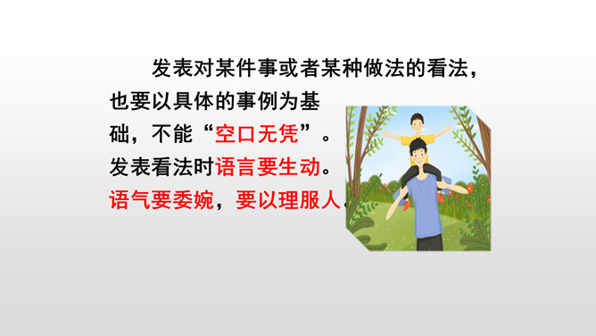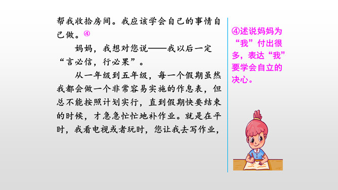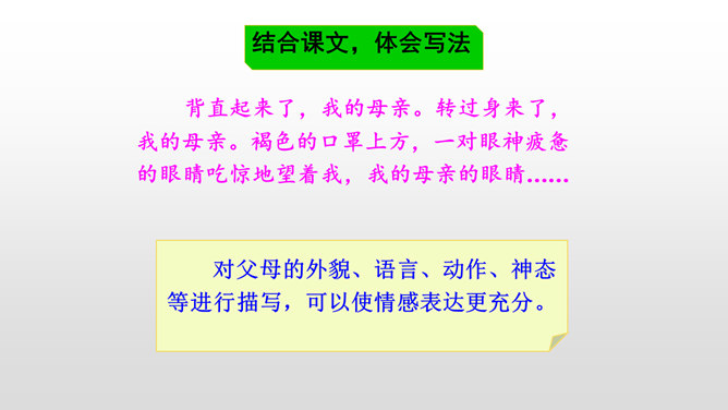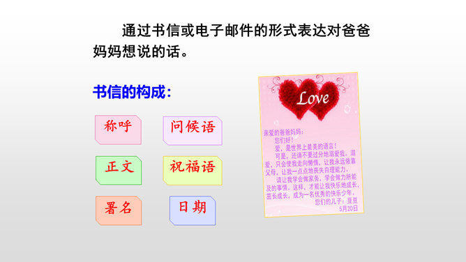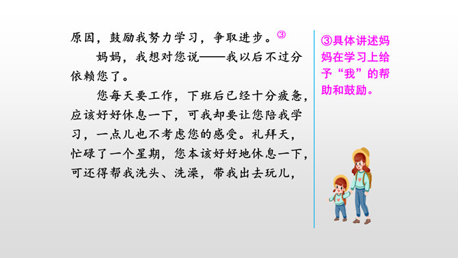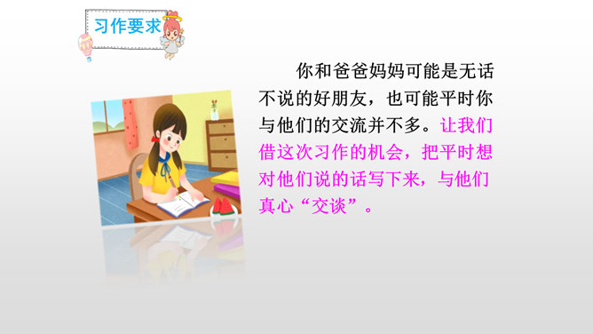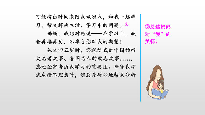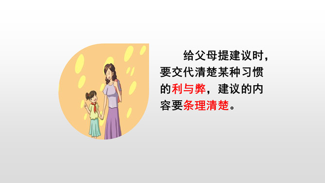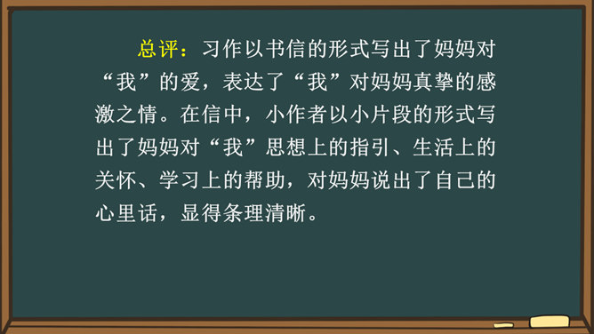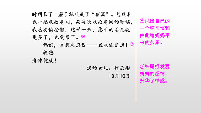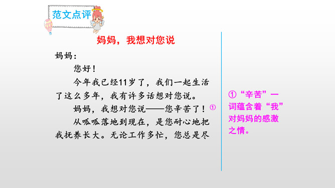 发表对某件事或者某种做法的看法,也要以具体的事例为基础,不能“空口无凭”。发表看法时语言要生动。语气要委婉,要以理服人。给父母提建议时,要交代清楚某种习惯的利与弊,建议的内容要条理清楚。对父母的外貌、语言、动作、神态等进行描写,可以使情感表达更充分。总评:习作以书信的形式写出了妈妈对“我”的爱,表达了“我”对妈妈真挚的感激之情。在信中,小作者以小片段的形式写出了妈妈对“我”思想上的指引、生活上的关怀、学习上的帮助,对妈妈说出了自己的心里话,显得条理清晰。所属专题:我想对您说ppt。