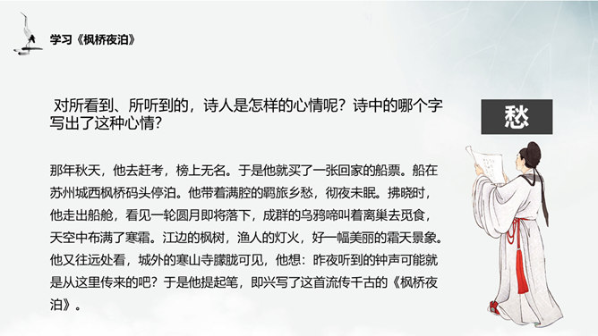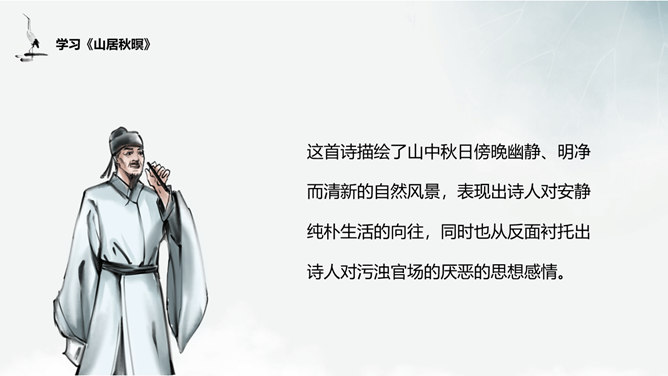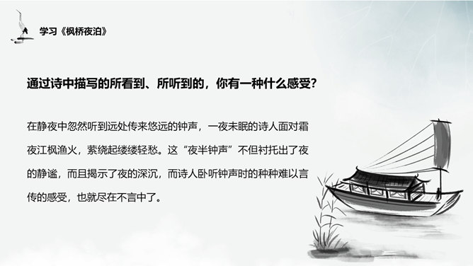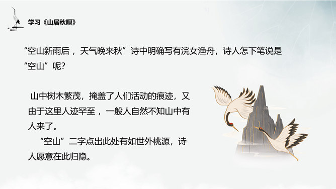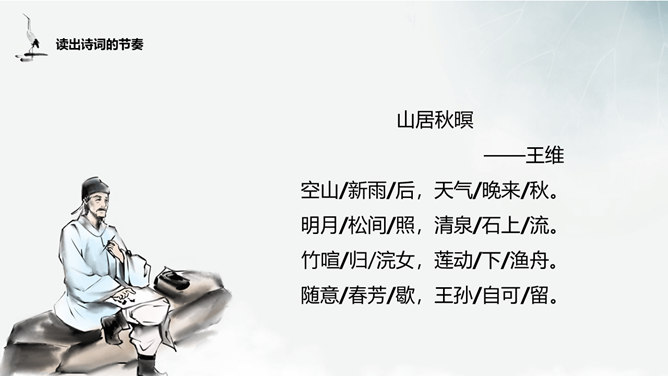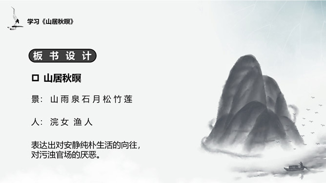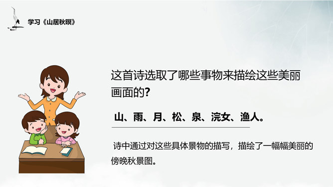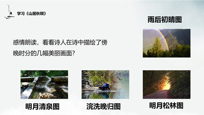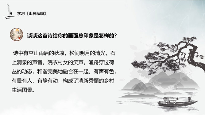谈谈这首诗给你的画面总印象是怎样的?诗中有空山雨后的秋凉,松间明月的清光,石上清泉的声音,浣衣村女的笑声,渔舟穿过荷丛的动态,和谐完美地融合在一起,有声有色,有景有人,有静有动,构成了清新秀丽的乡村生活图景。 空山新雨后 ,天气晚来秋”诗中明确写有浣女渔舟,诗人怎下笔说是“空山”呢?山中树木繁茂,掩盖了人们活动的痕迹,又由于这里人迹罕至 ,一般人自然不知山中有人来了。“空山”二字点出此处有如世外桃源,诗人愿意在此归隐。通过诗中描写的所看到、所听到的,你有一种什么感受?