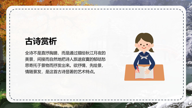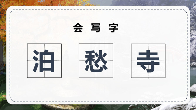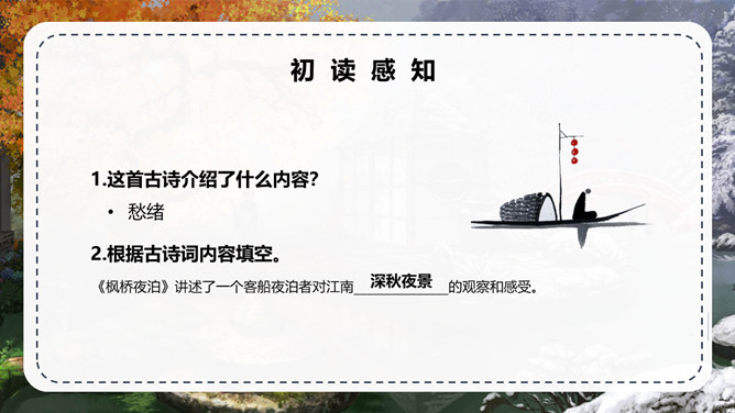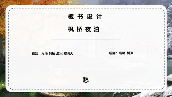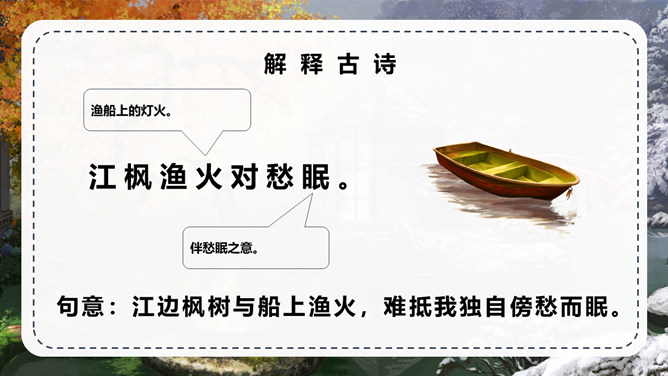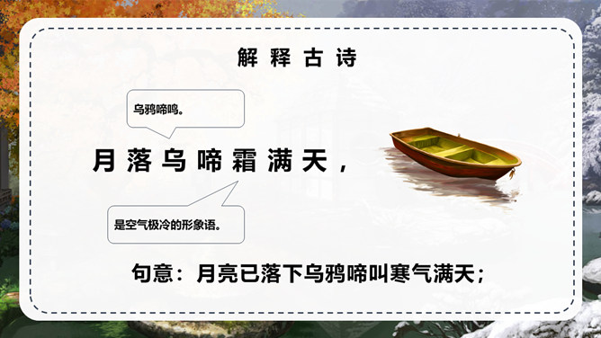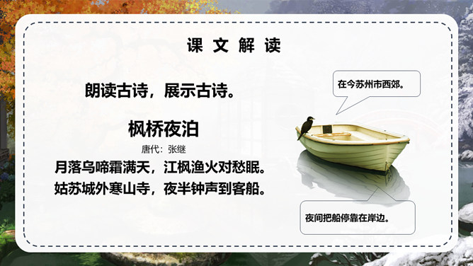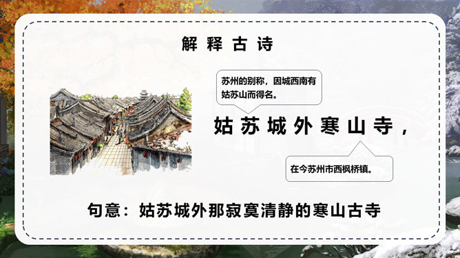 张继:字懿孙,汉族,湖北襄州人。唐代诗人,与刘长卿为同时代人。他的诗爽朗激越,不事雕琢,比兴幽深,事理双切,对后世颇有影响。但可惜流传下来的不多。句意:月亮已落下乌鸦啼叫寒气满天;句意:江边枫树与船上渔火,难抵我独自傍愁而眠。 句意:姑苏城外那寂寞清静的寒山古寺。半夜里敲响的钟声传到了我乘坐的客船。背诵这首古诗。