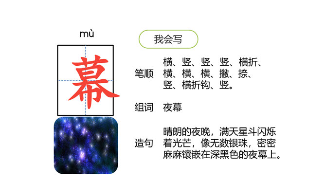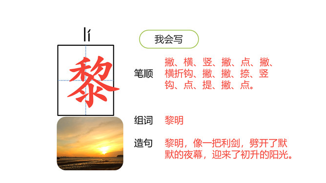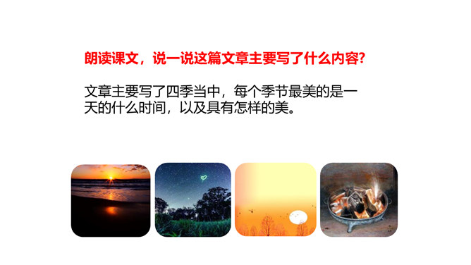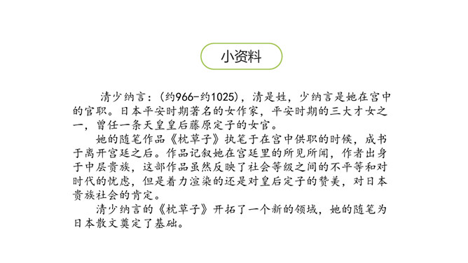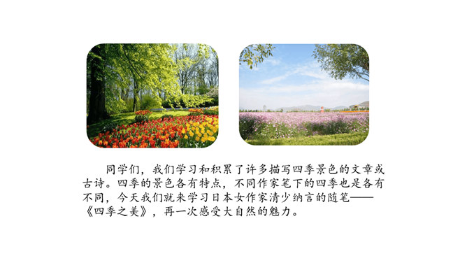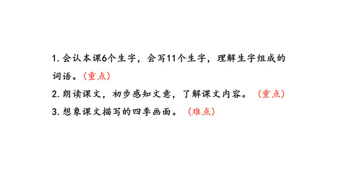 1.会认本课6个生字,会写11个生字,理解生字组成的词语。(重点)2.朗读课文,初步感知文意,了解课文内容。 (重点)3.想象课文描写的四季画面。 (难点) 同学们,我们学习和积累了许多描写四季景色的文章或古诗。四季的景色各有特点,不同作家笔下的四季也是各有不同,今天我们就来学习日本女作家清少纳言的随笔,再一次感受大自然的魅力。文章主要写了四季当中,每个季节最美的是一天的什么时间,以及具有怎样的美。所属专题:四季之美ppt。