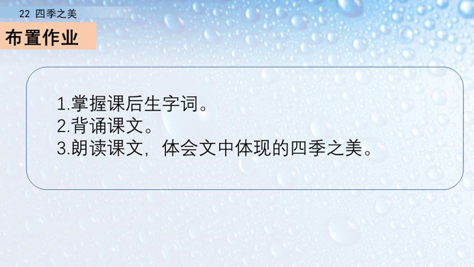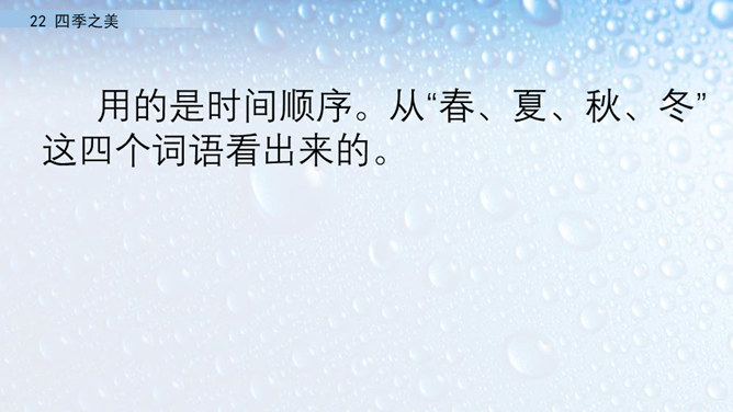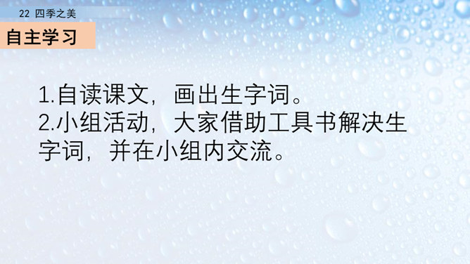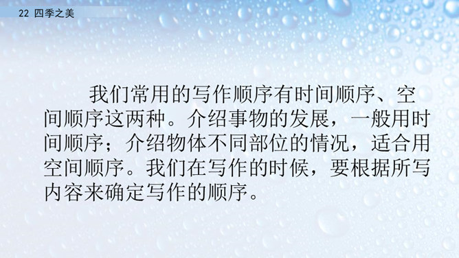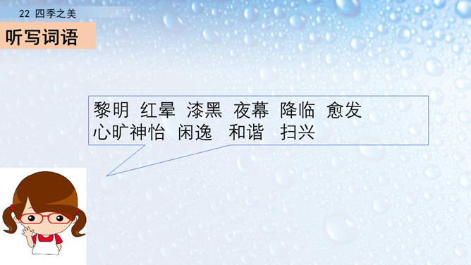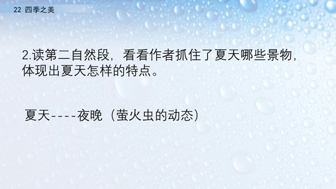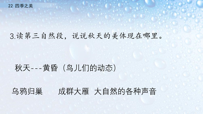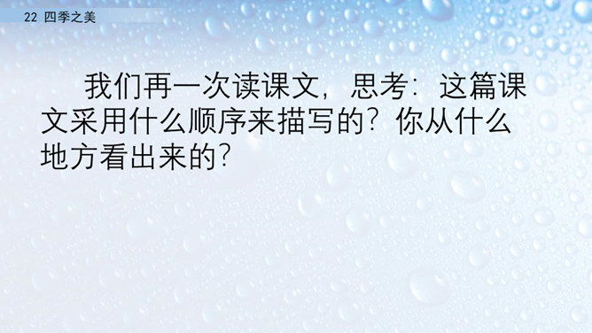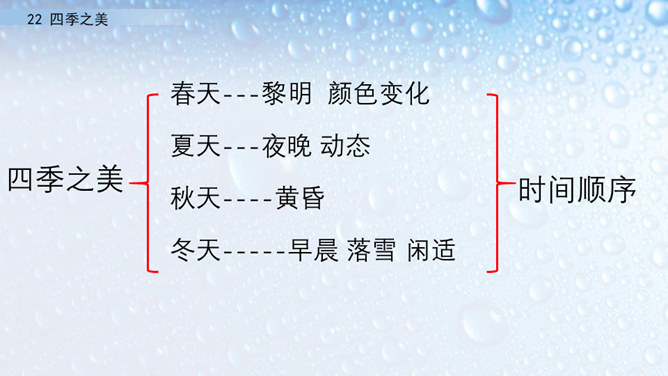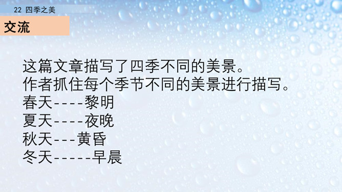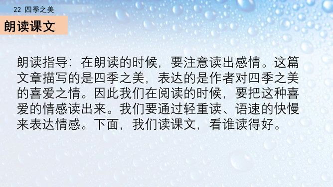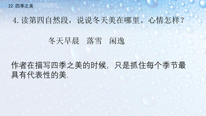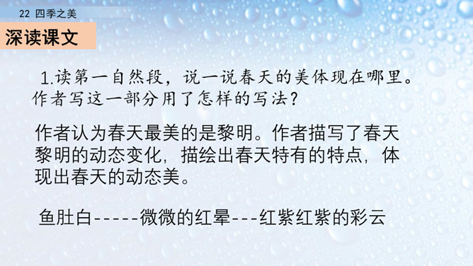 朗读指导:在朗读的时候,要注意读出感情。这篇文章描写的是四季之美,表达的是作者对四季之美的喜爱之情。因此我们在阅读的时候,要把这种喜爱的情感读出来。我们要通过轻重读、语速的快慢来表达情感。下面,我们读课文,看谁读得好。1.读第一自然段,说一说春天的美体现在哪里。作者写这一部分用了怎样的写法?作者认为春天最美的是黎明。作者描写了春天黎明的动态变化,描绘出春天特有的特点,体现出春天的动态美。所属专题:四季之美ppt。