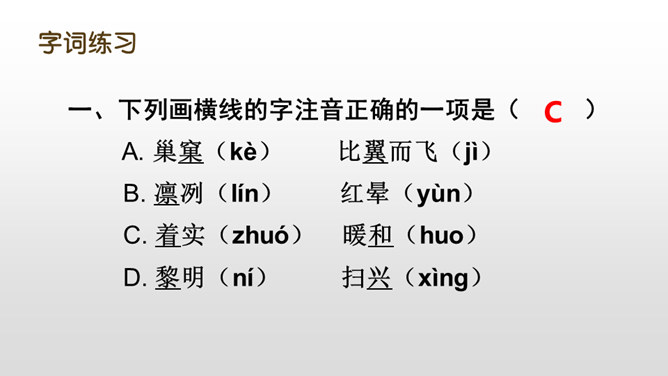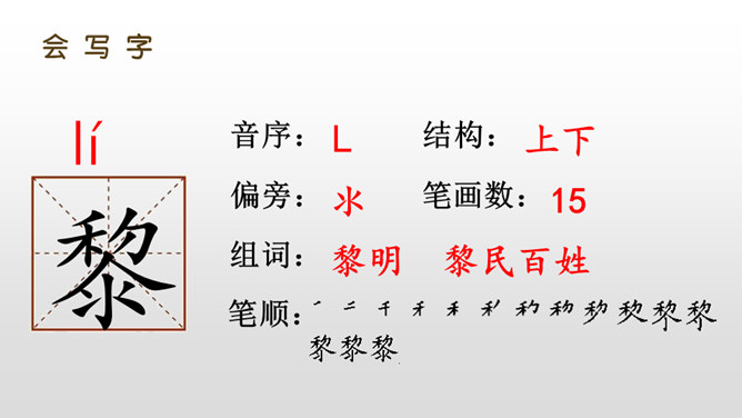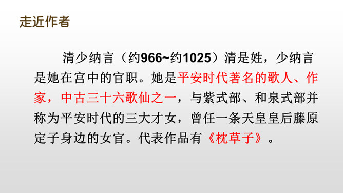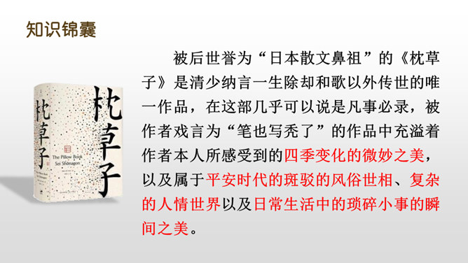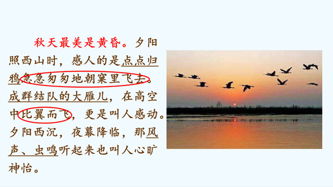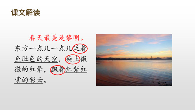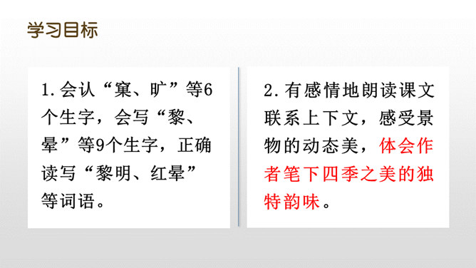 你最喜欢一年中的哪个季节呢?把你喜欢的理由分享给大家听一听吧!有感情地朗读课文联系上下文,感受景物的动态美,体会作者笔下四季之美的独特韵味。这篇短文是按照时间的顺序来描述四季之美的。从中,我们可以体会到作者热爱大自然、热爱四季的感情。会认“窠、旷”等6个生字,会写“黎、晕”等9个生字,正确读写“黎明、红晕”等词语。所属专题:四季之美ppt。