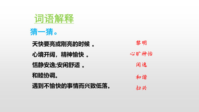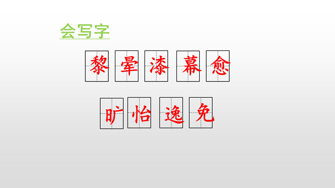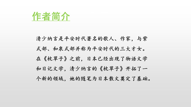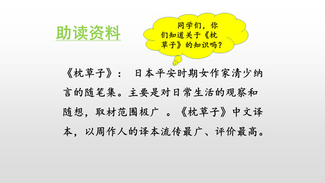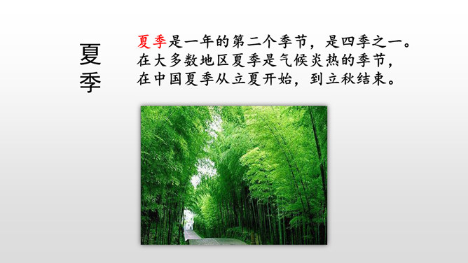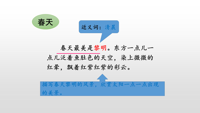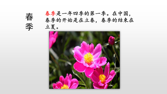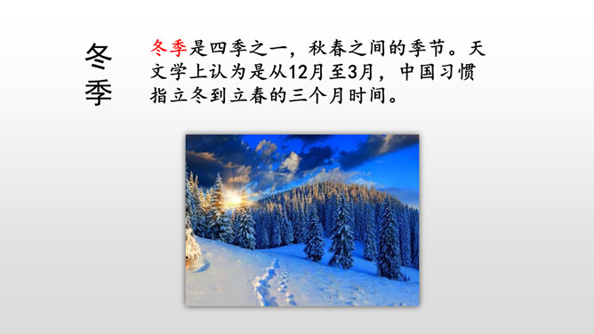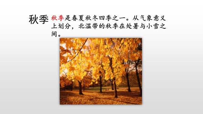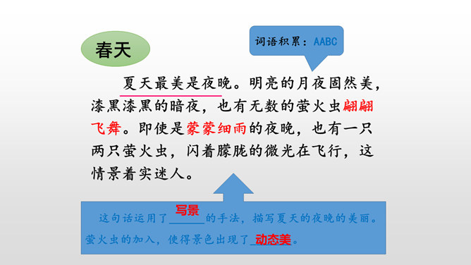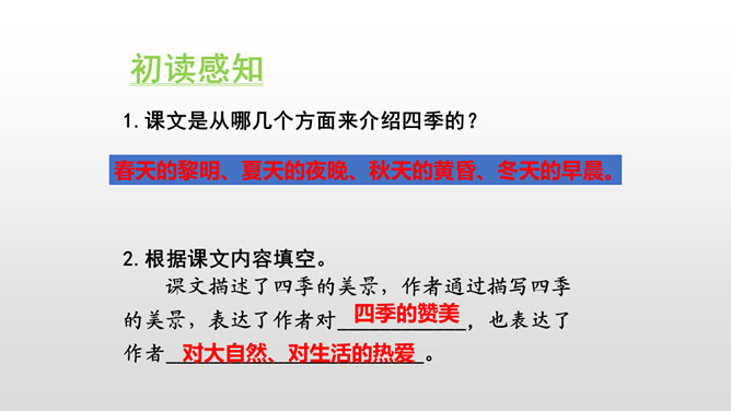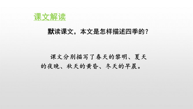 默读课文,本文是怎样描述四季的? 课文分别描写了春天的黎明、夏天的夜晚、秋天的黄昏、冬天的早晨。描写春天黎明的风景,欣赏太阳一点一点出现的美景。这句话运用了写景的手法,描写夏天的夜晚的美丽。萤火虫的加入,使得景色出现了动态美。写景:将夕阳的静态美和大雁高飞的动态美结合起来。对比:描写寒冷的冬晨的美景,又将其与暖炉相照应,制造出和谐的生活。文章以此结尾,毫不拖沓,只有意犹未尽的感觉。所属专题:四季之美ppt。