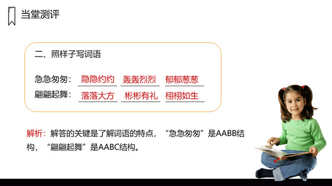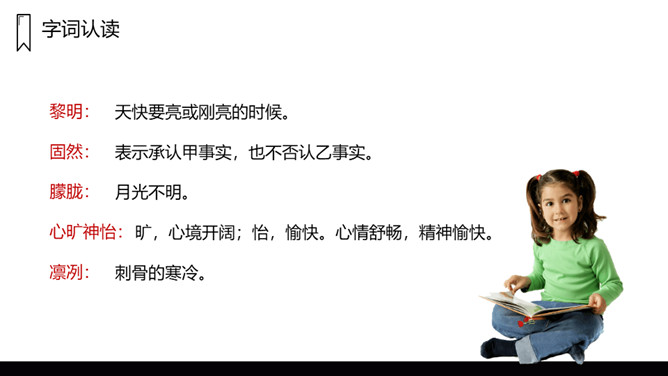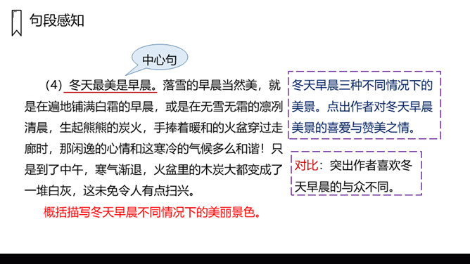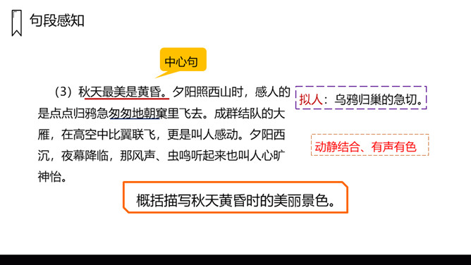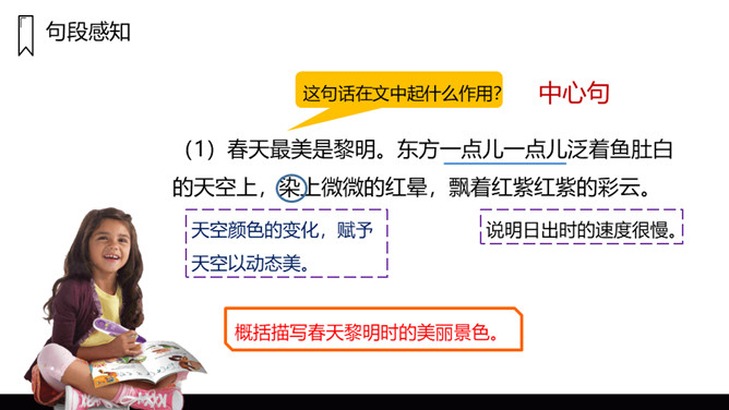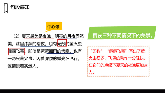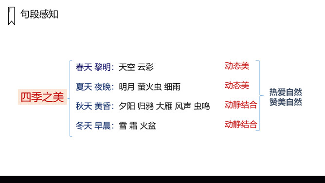 “无数” “翩翩飞舞”写出了萤火虫很多,飞舞的动作十分轻快,在它们的点缀下夏天的夜晚更加迷人。本文主要描写了每个季节最美的时候的美景,表达了作者对大自然的喜爱和赞美之情。心旷神怡:心情舒畅,精神愉快。天空颜色的变化,赋予天空以动态美。说明日出时的速度很慢。概括描写春天黎明时的美丽景色。概括描写秋天黄昏时的美丽景色。冬天早晨三种不同情况下的美景。点出作者对冬天早晨美景的喜爱与赞美之情。所属专题:四季之美ppt。