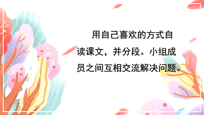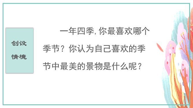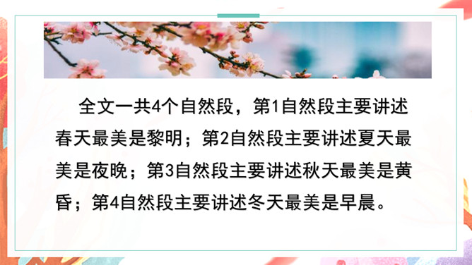 一年四季,你最喜欢哪个季节?你认为自己喜欢的季节中最美的景物是什么呢?用自己喜欢的方式自读课文,并分段。小组成员之间互相交流解决问题。全文一共4个自然段,第1自然段主要讲述春天最美是黎明;第2自然段主要讲述夏天最美是夜晚;第3自然段主要讲述秋天最美是黄昏;第4自然段主要讲述冬天最美是早晨。这篇文章是按什么顺序写的?课文的主要内容是什么呢?这篇散文结构单纯,是按时间顺序来安排材料的。所属专题:四季之美ppt。