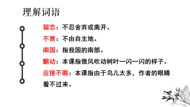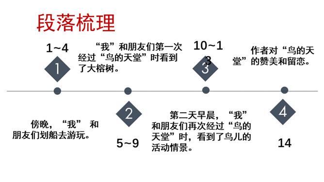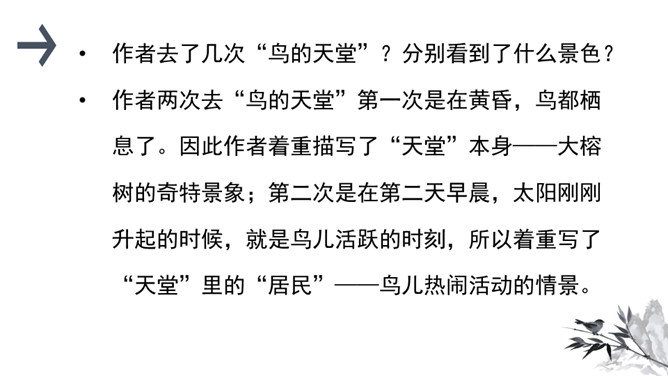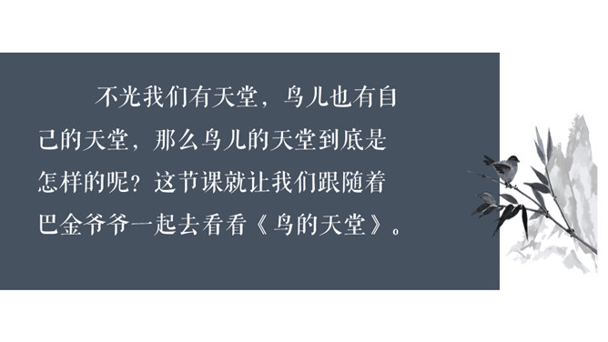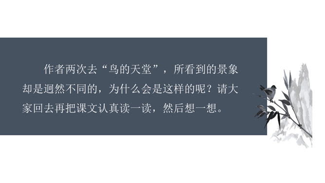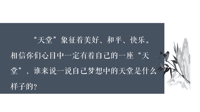 “天堂”象征着美好、和平、快乐。相信你们心目中一定有着自己的一座“天堂”,谁来说一说自己梦想中的天堂是什么样子的?不光我们有天堂,鸟儿也有自己的天堂,那么鸟儿的天堂到底是怎样的呢?这节课就让我们跟随着巴金爷爷一起去看看《鸟的天堂》。用横线画出文中你认为写得美的词句来读一读,并仔细体会。作者所看到的景象却是迥然不同的,为什么会是这样的呢?请大家回去再把课文认真读一读,然后想一想。所属专题:鸟的天堂ppt。