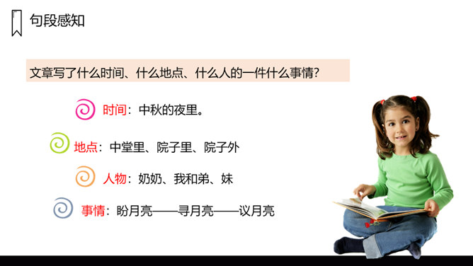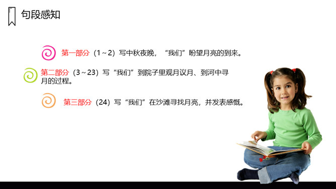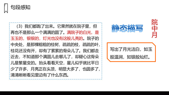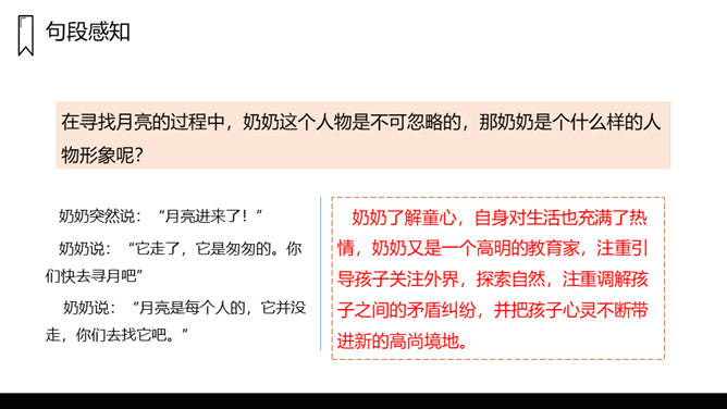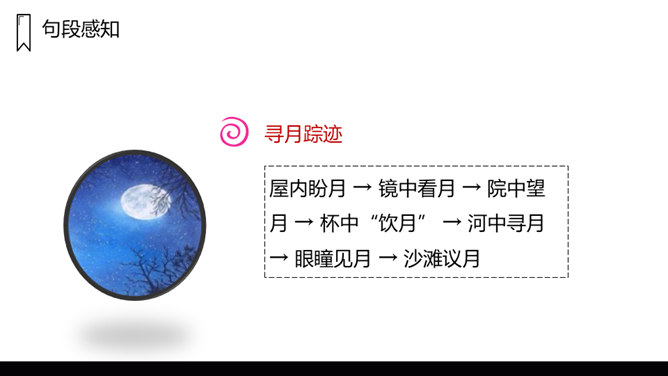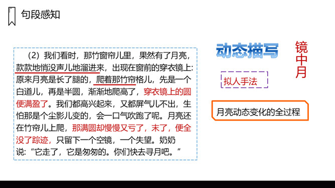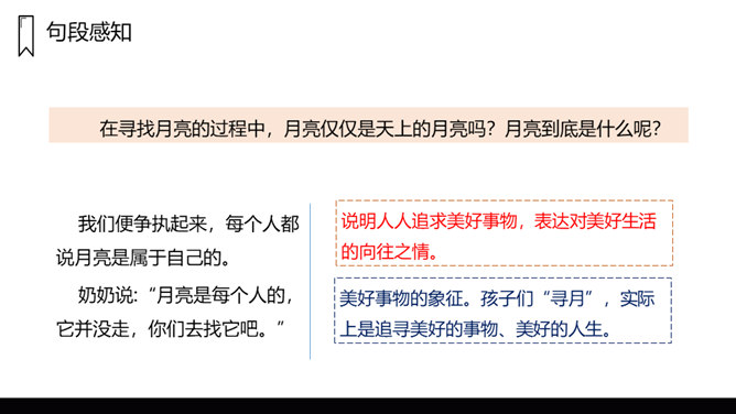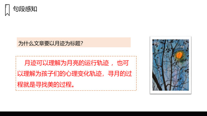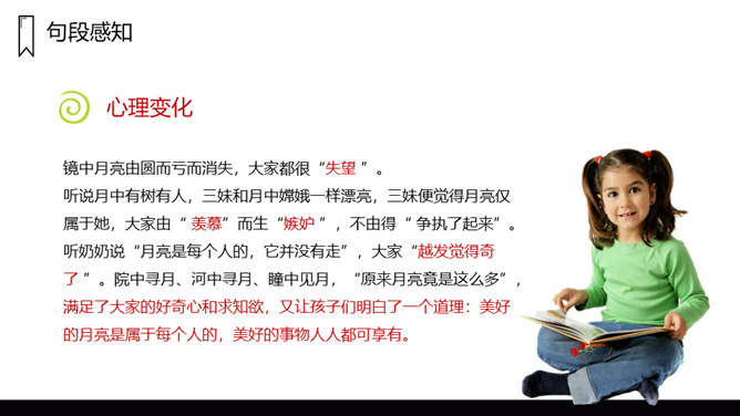 文章写了什么时间、什么地点、什么人的一件什么事情?镜中月亮由圆而亏而消失,大家都很“失望 ”。听说月中有树有人,三妹和月中嫦娥一样漂亮,三妹便觉得月亮仅属于她,大家由“ 羡慕”而生“嫉妒 ”,不由得“ 争执了起来”。听奶奶说“月亮是每个人的,它并没有走”,大家“越发觉得奇了 ”。院中寻月、河中寻月、瞳中见月,“原来月亮竟是这么多”,满足了大家的好奇心和求知欲,又让孩子们明白了一个道理:美好的月亮是属于每个人的,美好的事物人人都可享有。在寻找月亮的过程中,月亮仅仅是天上的月亮吗?月亮到底是什么呢?所属专题:月迹ppt。