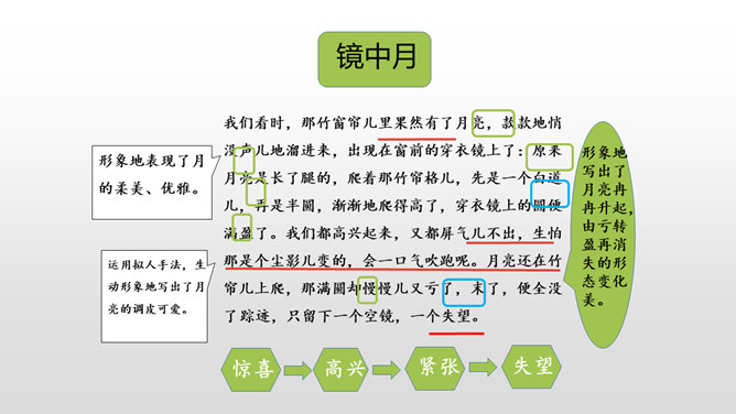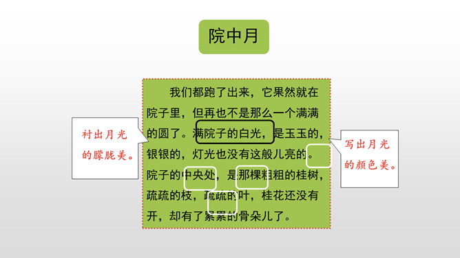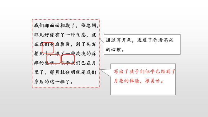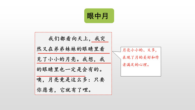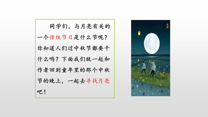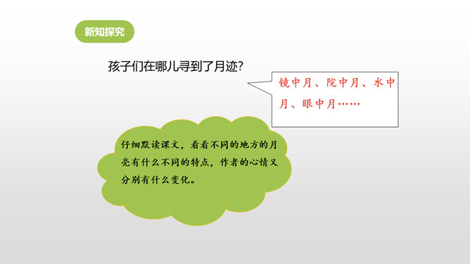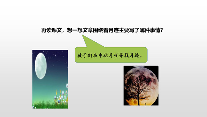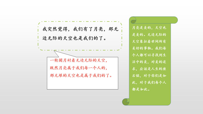 仔细默读课文,看看不同的地方的月亮有什么不同的特点,作者的心情又分别有什么变化。形象地写出了月亮冉冉升起,由亏转盈再消失的形态变化美。一轮圆月衬着无边无际的天空,既然月亮属于我们每一个人的,那无垠的天空也是属于我们的了。 月亮是美的,天空也是美的。无边无际的天空象征着世间所有美好的事物。我们每个人都可以寻找到生活中的美,对美的追求,应该是人生的座右铭,对于你们是如此,对于我们每个人都是如此。所属专题:月迹ppt。