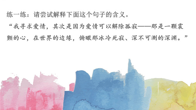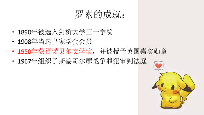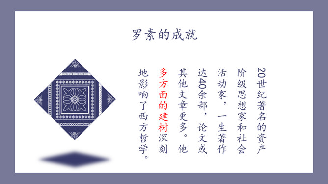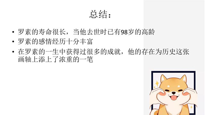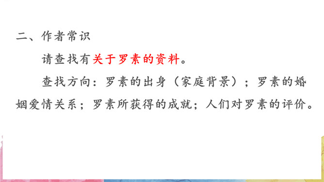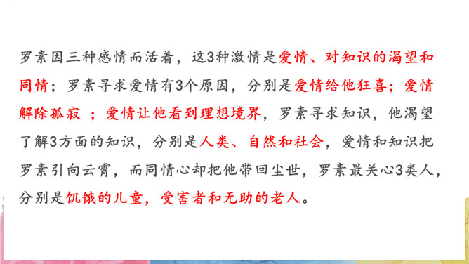 请查找有关于罗素的资料。查找方向:罗素的出身(家庭背景);罗素的婚姻爱情关系;罗素所获得的成就;人们对罗素的评价。数字“3”仿佛无处不在,西方认为数字“3”是神秘的,请围绕数字“3”,再次梳理文章。罗素因三种感情而活着,这3种激情是爱情、对知识的渴望和同情;罗素寻求爱情有3个原因,分别是爱情给他狂喜;爱情解除孤寂 ;爱情让他看到理想境界,罗素寻求知识,他渴望了解3方面的知识,分别是人类、自然和社会,爱情和知识把罗素引向云霄,而同情心却把他带回尘世,罗素最关心3类人,分别是饥饿的儿童,受害者和无助的老人。所属专题:我为什么而活着ppt。