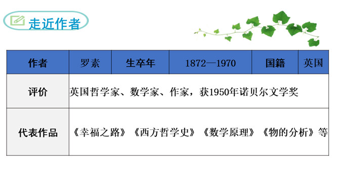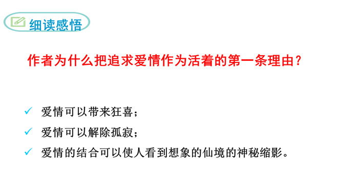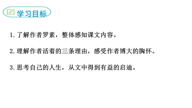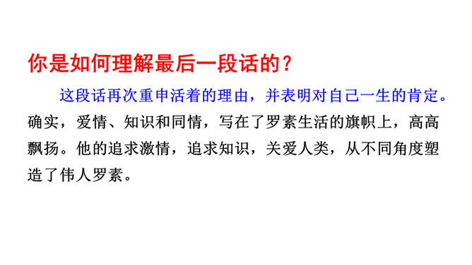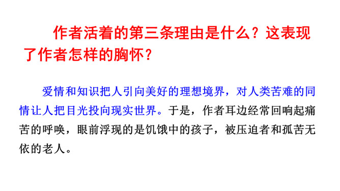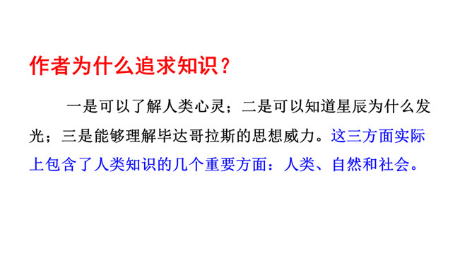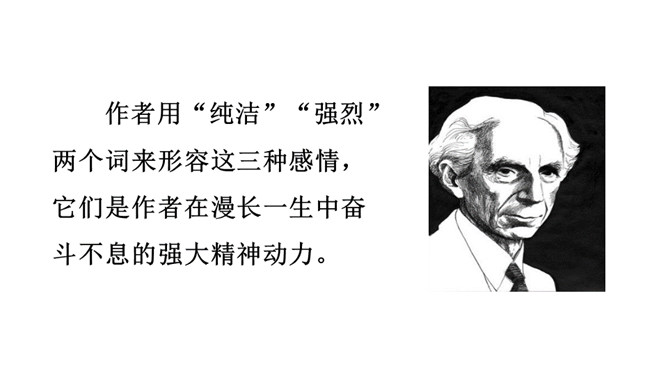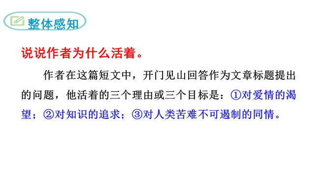 说说作者为什么活着。作者在这篇短文中,开门见山回答作为文章标题提出的问题,他活着的三个理由或三个目标是:①对爱情的渴望;②对知识的追求;③对人类苦难不可遏制的同情。作者用“纯洁”“强烈”两个词来形容这三种感情,它们是作者在漫长一生中奋斗不息的强大精神动力。作者为什么追求知识?一是可以了解人类心灵;二是可以知道星辰为什么发光;三是能够理解毕达哥拉斯的思想威力。这三方面实际上包含了人类知识的几个重要方面:人类、自然和社会。所属专题:我为什么而活着ppt。