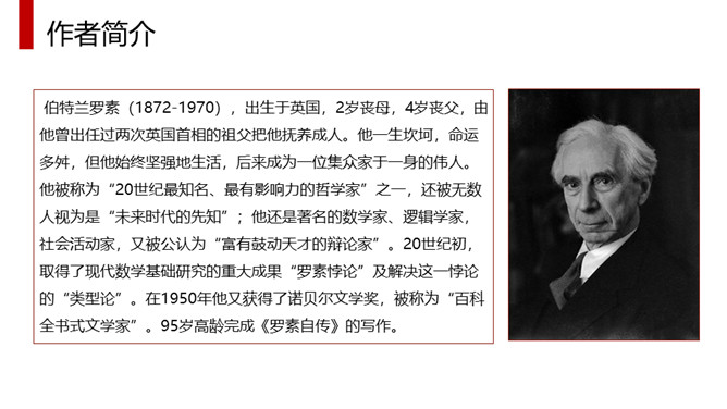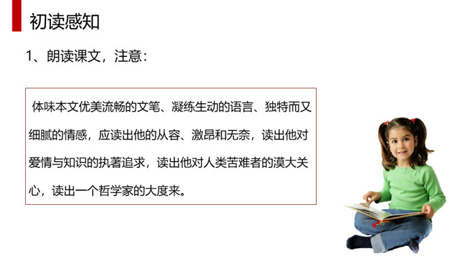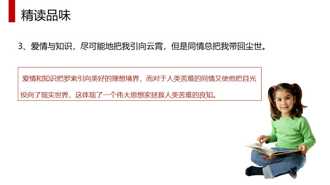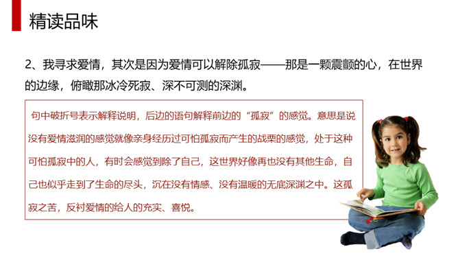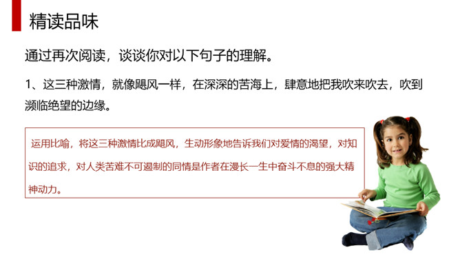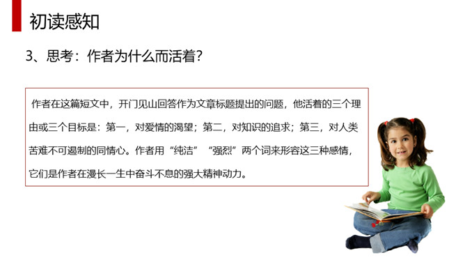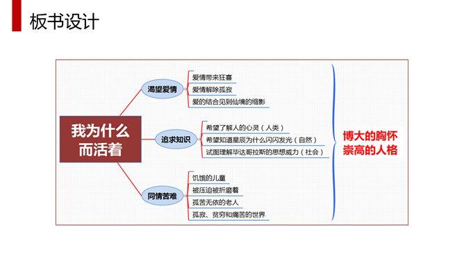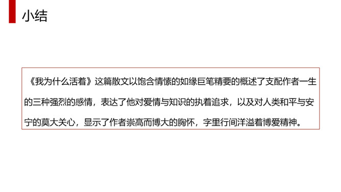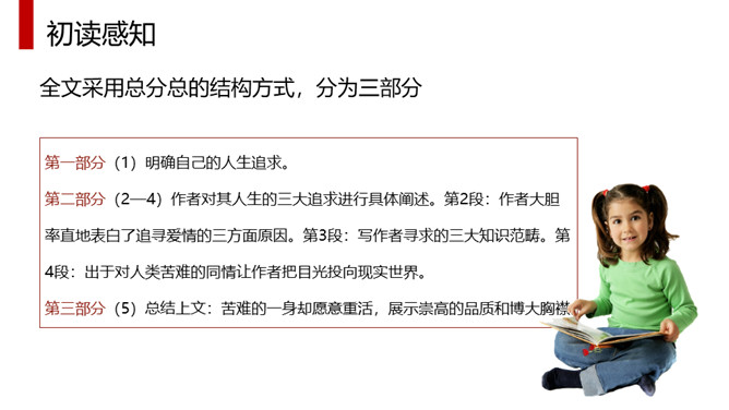 体味本文优美流畅的文笔、凝练生动的语言、独特而又细腻的情感,应读出他的从容、激昂和无奈,读出他对爱情与知识的执著追求,读出他对人类苦难者的漠大关心,读出一个哲学家的大度来。全文采用总分总的结构方式,分为三部分。第一部分(1)明确自己的人生追求。第二部分(2—4)作者对其人生的三大追求进行具体阐述。第2段:作者大胆率直地表白了追寻爱情的三方面原因。第3段:写作者寻求的三大知识范畴。第4段:出于对人类苦难的同情让作者把目光投向现实世界。第三部分(5)总结上文:苦难的一身却愿意重活,展示崇高的品质和博大胸襟。