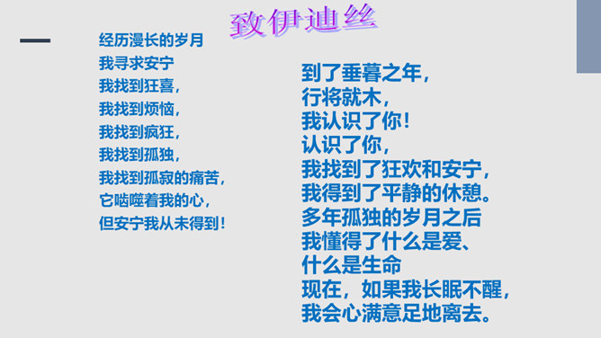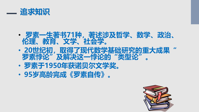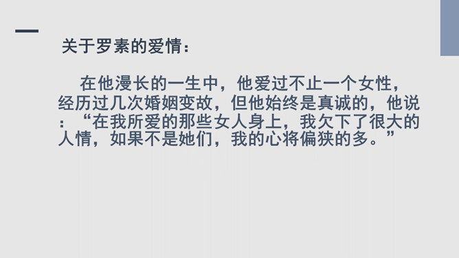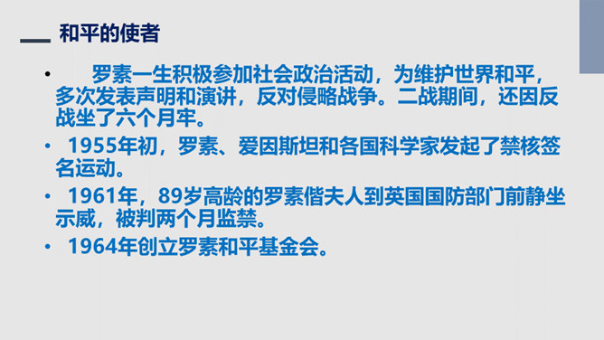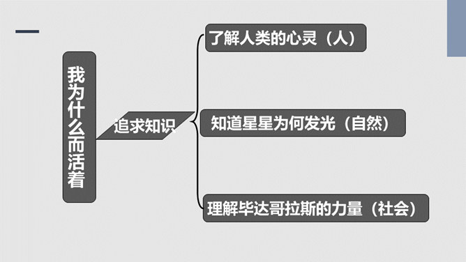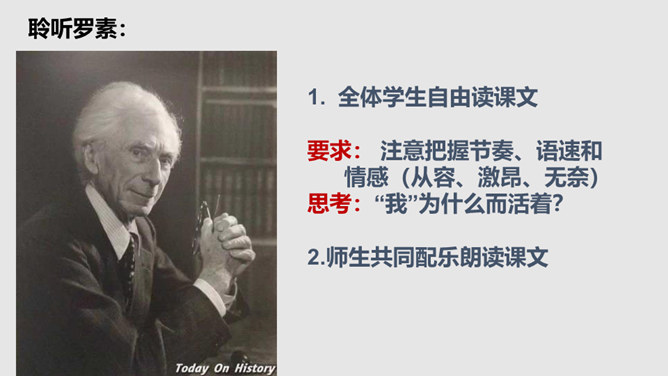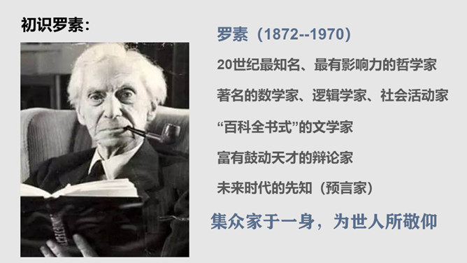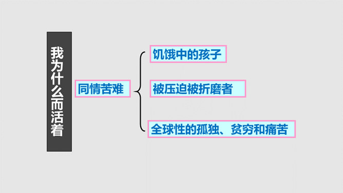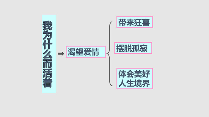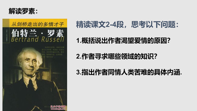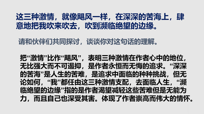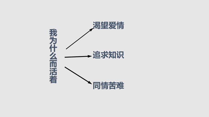 把“激情”比作“飓风”,表明三种激情在作者心中的地位,无比强大而不可遏抑,是作者永恒而无悔的追求。“深深的苦海”是人生的苦难,是追求中面临的种种挑战,但无论如何,“我”都任由这三种激情支配,去面临人生,“濒临绝望的边缘”指的是作者渴望减轻这些苦难但是无能为力,而且自己也深受其害。体现了作者崇高而伟大的情怀。罗素活着的意义无疑是崇高的,有价值的,在罗素面前,我们无疑是渺小的,无论是就其成就而言,还是其思想而言,我们都不能不景仰他。我们每个同学都应该叩问一下自己的心灵,我们又是为什么而活着?所属专题:我为什么而活着ppt。