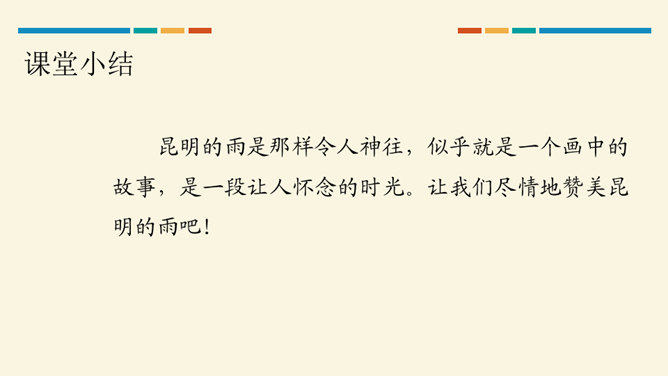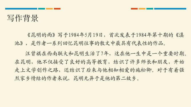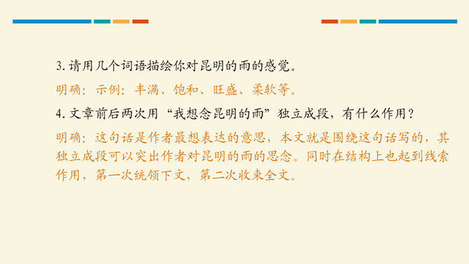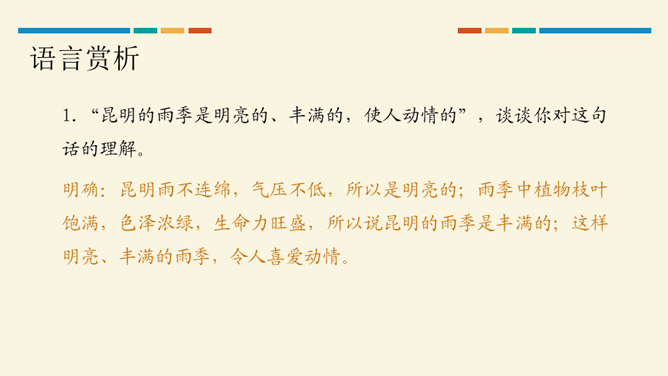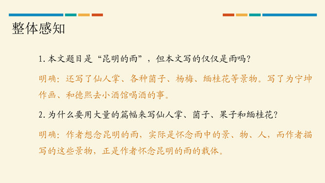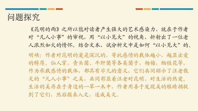 之所以能对读者产生强大的艺术感染力,就在于作者对“凡人小事”的审视,用“以小见大”的视角,折射出了一位老人浓烈如火的情怀。结合文本,试分析文中是如何“以小见大”的。作者对昆明的爱是深沉的,寄托感情的载体越小,越显出爱的醇厚。仙人掌,青头菌、牛肝菌等各类菌子,杨梅,缅桂花等,作为承载感情的载体,都具有非凡的意义,它们共同昭示了汪老散文的“凡人小事”之美,共同彰显着汪老对昆明、对生活的热爱。生活的美存在于身边的一草一木中,作者用善于发现美的眼睛捕捉到了它们,然后携来入文,遂成美文。所属专题:昆明的雨ppt。