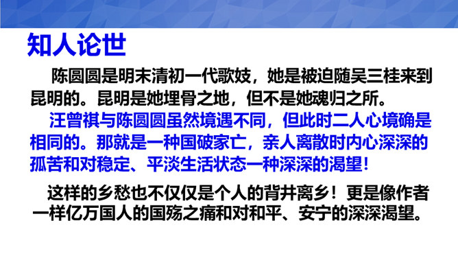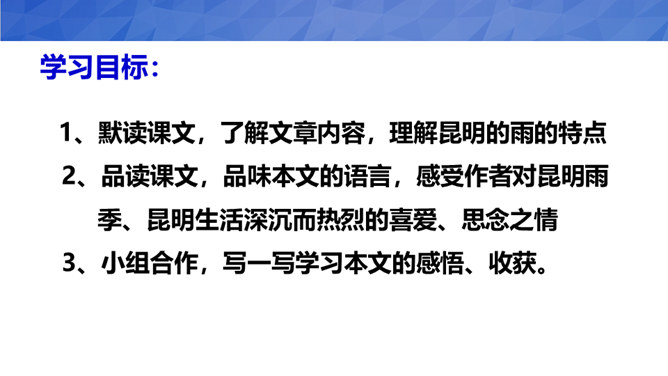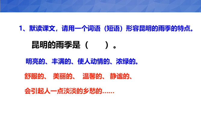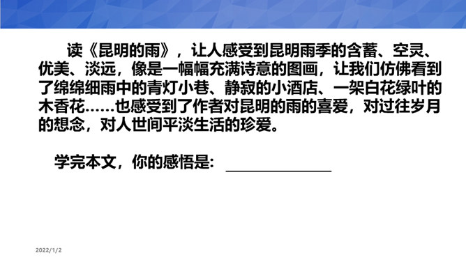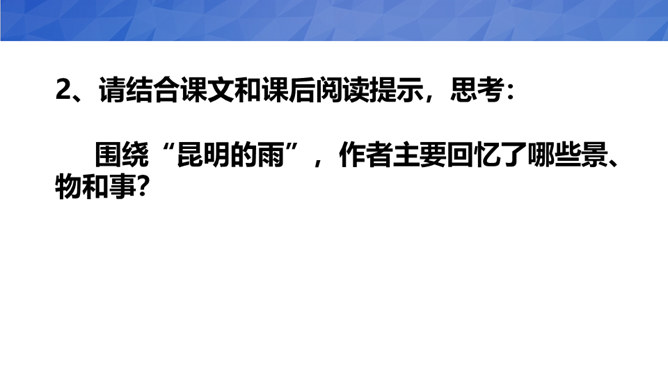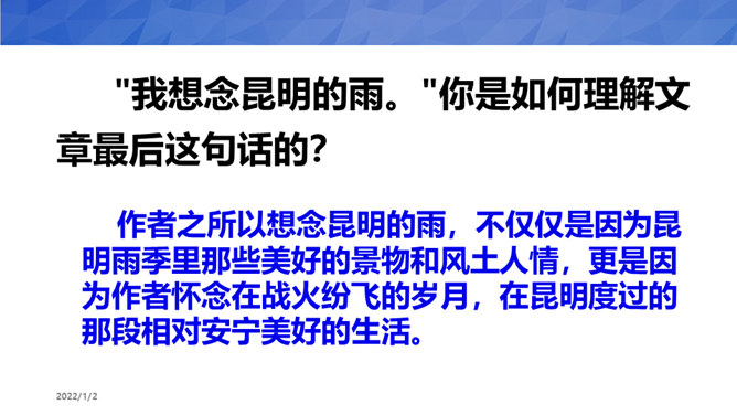 1、默读课文,了解文章内容,理解昆明的雨的特点。2、品读课文,品味本文的语言,感受作者对昆明雨季、昆明生活深沉而热烈的喜爱、思念之情3、小组合作,写一写学习本文的感悟、收获。汪曾祺与陈圆圆虽然境遇不同,但此时二人心境确是相同的。那就是一种国破家亡,亲人离散时内心深深的孤苦和对稳定、平淡生活状态一种深深的渴望!作者之所以想念昆明的雨,不仅仅是因为昆明雨季里那些美好的景物和风土人情,更是因为作者怀念在战火纷飞的岁月,在昆明度过的那段相对安宁美好的生活。所属专题:昆明的雨ppt。