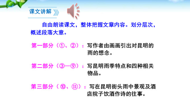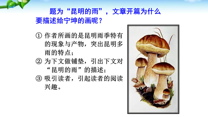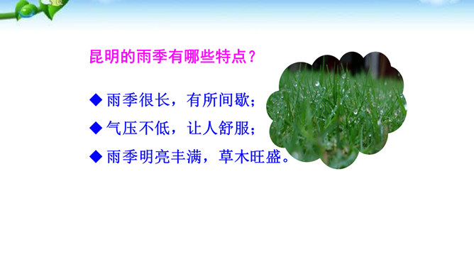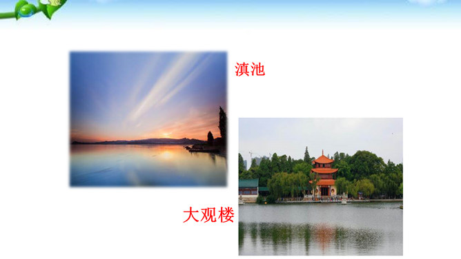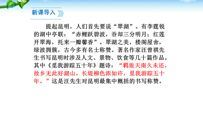 提起昆明,人们首先要说“翠湖”。有李霆锐的湖中亭联:“赤鲤跃碧波,吞却三分明月;红莲开翠海,托来一瓣馨香”。翠湖之美,楼阁屋舍,绿波拥簇,古今多有名士称赞。著名作家汪曾祺先生书写昆明时涉及人文、景物、饮食等几十篇作品。其中《觅我游踪五十年》题诗:“羁旅天南久未还,故乡无此好湖山。长堤柳色浓如许,觅我游踪五十年。”这是汪先生对昆明最集中概括的书写称赞。所属专题:昆明的雨ppt。