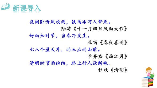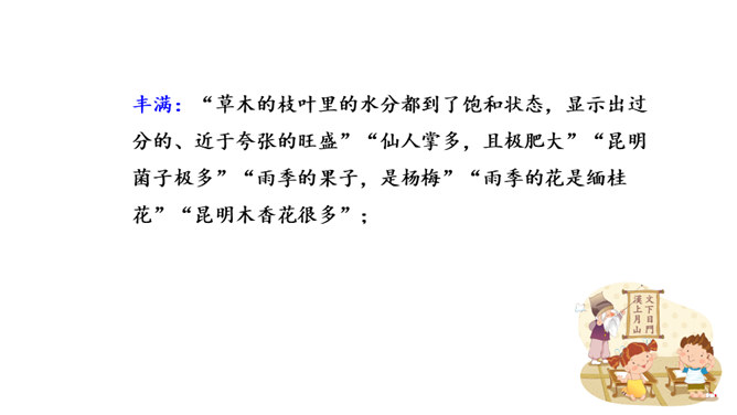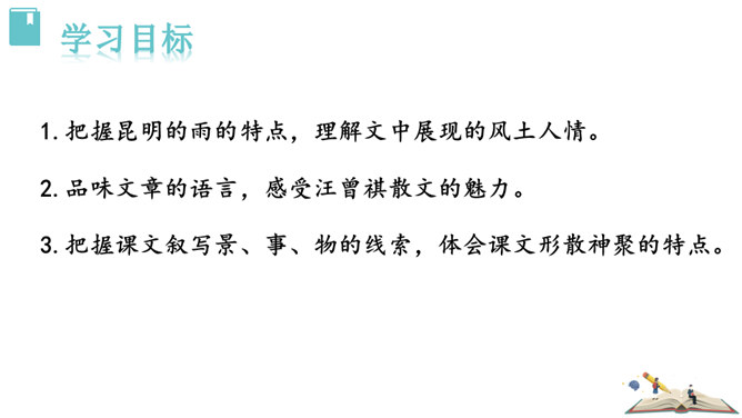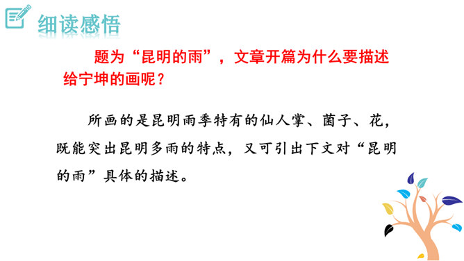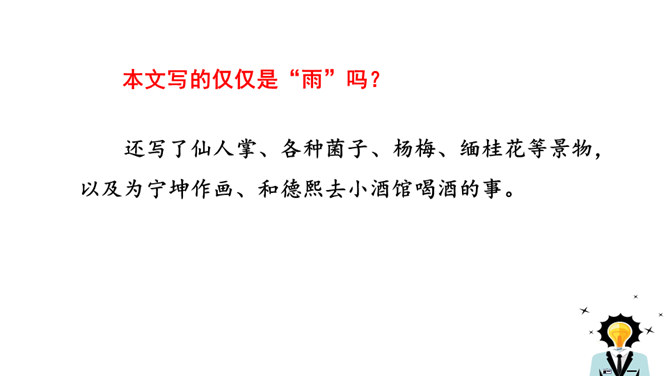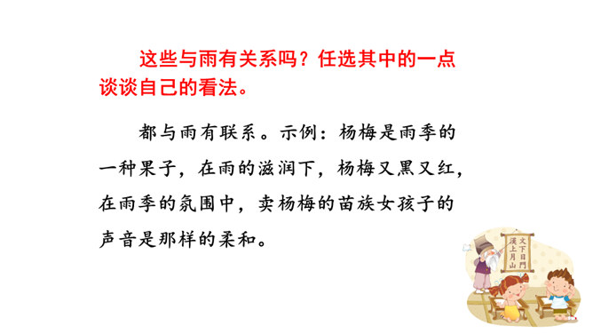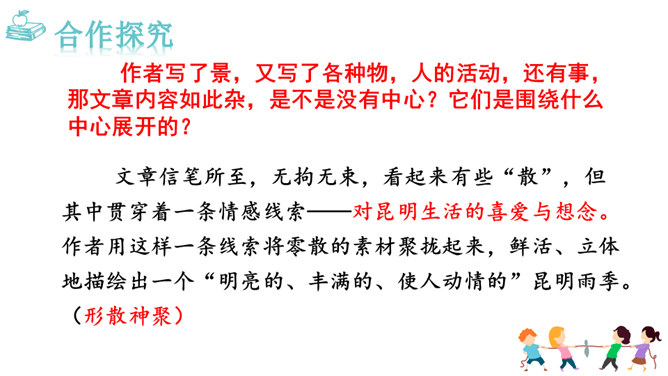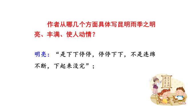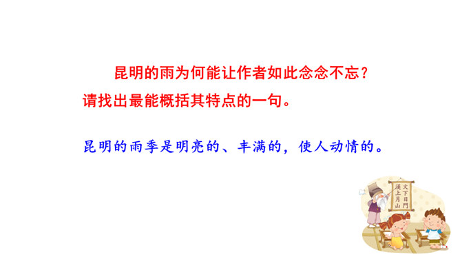这些与雨有关系吗?任选其中的一点谈谈自己的看法。都与雨有联系。示例:杨梅是雨季的一种果子,在雨的滋润下,杨梅又黑又红,在雨季的氛围中,卖杨梅的苗族女孩子的声音是那样的柔和。昆明的雨为何能让作者如此念念不忘?请找出最能概括其特点的一句。作者从哪几个方面具体写昆明雨季之明亮、丰满、使人动情?作者写了景,又写了各种物,人的活动,还有事,那文章内容如此杂,是不是没有中心?它们是围绕什么中心展开的?从哪些词句之中体会作者的这种感情?所属专题:昆明的雨ppt。