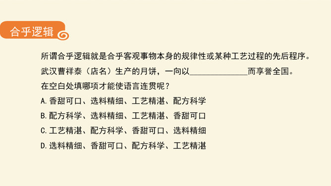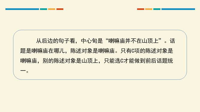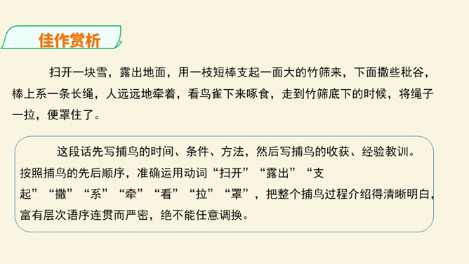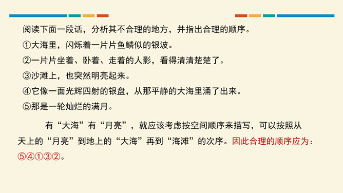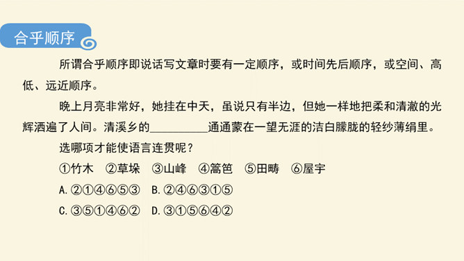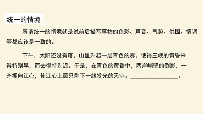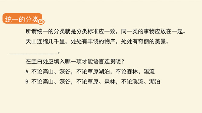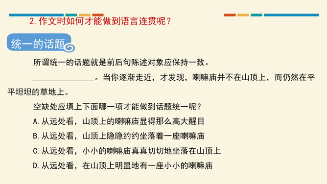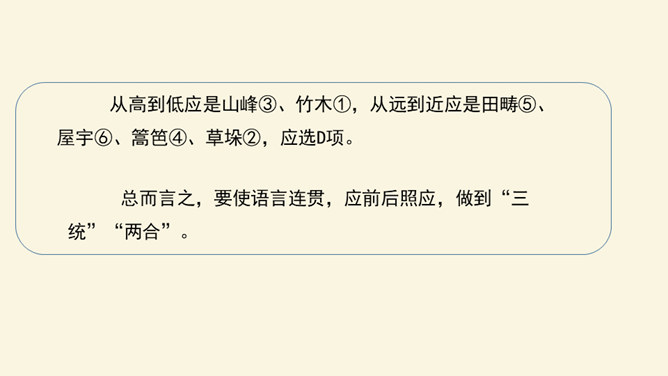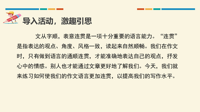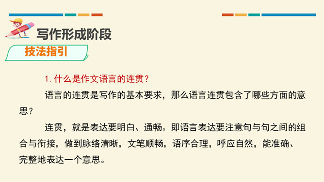 文从字顺,表意连贯是一项十分重要的语言能力。“连贯”是指表达的观点、角度、风格一致,读起来自然顺畅。我们在作文时,只有做到语言的通顺连贯,才能准确地表达自己的观点,抒发心中的情感。别人也才能通过文章更好地了解我们。今天,我们就来练习如何使我们的作文语言更加连贯,以提高我们的写作水平。什么是作文语言的连贯?语言的连贯是写作的基本要求,那么语言连贯包含了哪些方面的意思?连贯,就是表达要明白、通畅。即语言表达要注意句与句之间的组合与衔接,做到脉络清晰,文笔顺畅,语序合理,能准确、完整地表达一个意思。所属专题:语言要连贯ppt。
